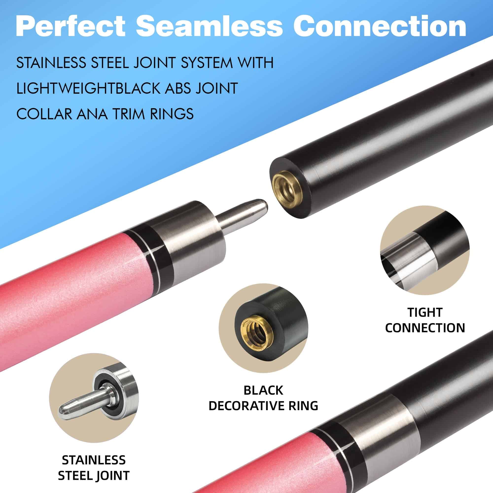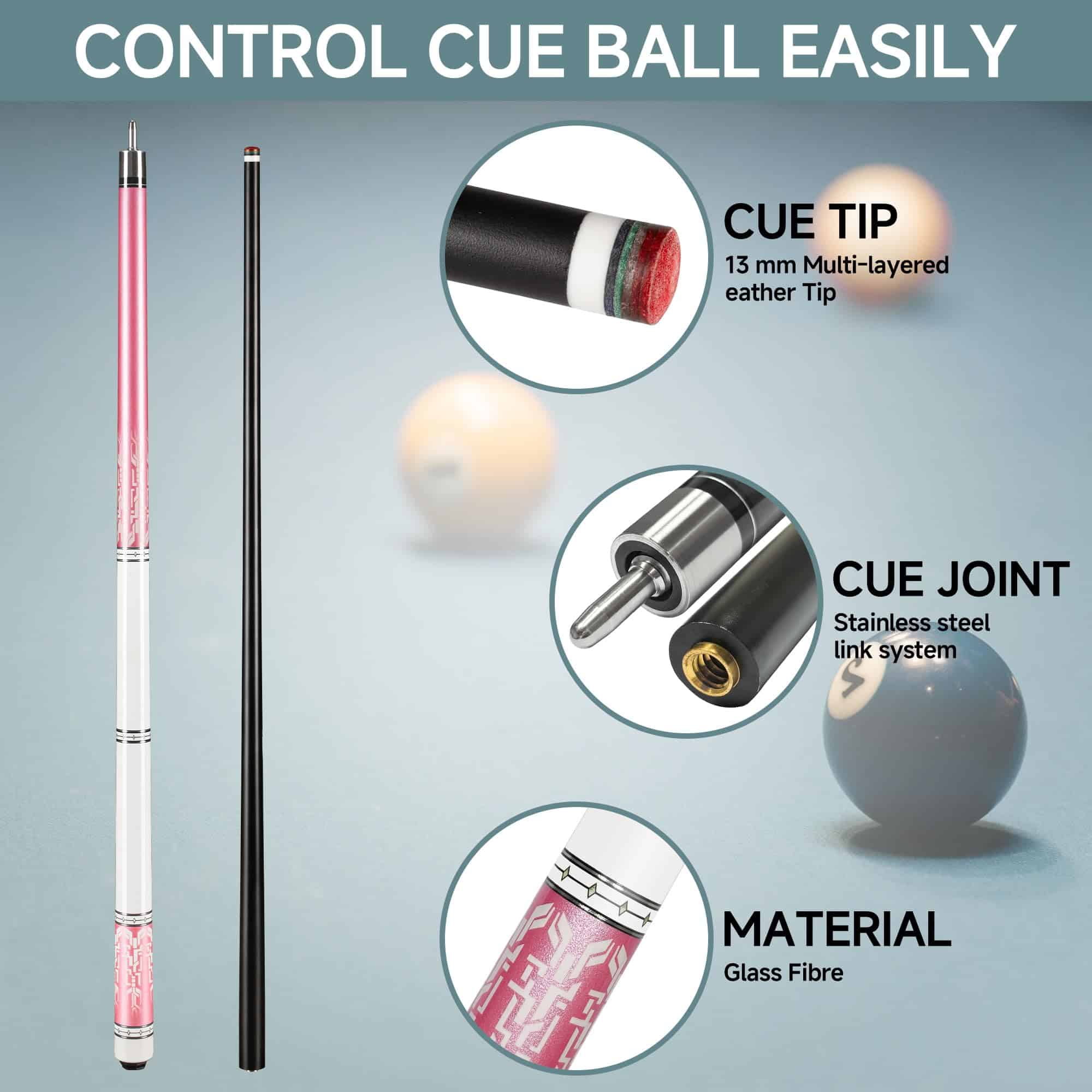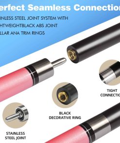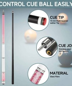 Palillo de Billar Profesional de Fibra de Vidrio de 58 pulgadas. La punta de cuero de 12.7 mm de calidad media de fibra te ayudará a sentirte cómodo rápidamente. Los detalles determinan la calidad del palo de billar. Conexión para palo de billar. Cuando juegas billar, es necesario tener una buena sensación para controlar fácilmente la bola de billar.