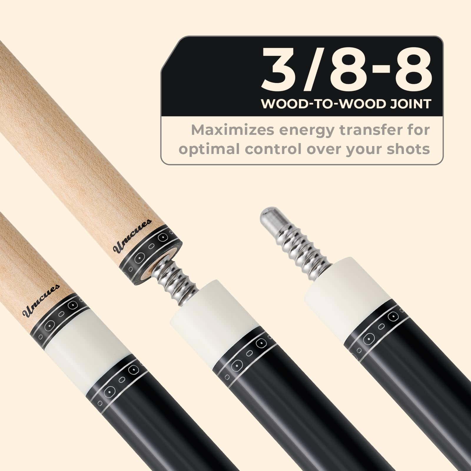 2. Junta de Madera a Madera: El palito de billar CUESSIR Unicues viene con una junta de madera a madera con pasador radial 3/88, que permite la transferencia máxima de energía desde el culo hasta la punta del palito de billar. Siente el poder fluir cuando golpeas la bola de billar.