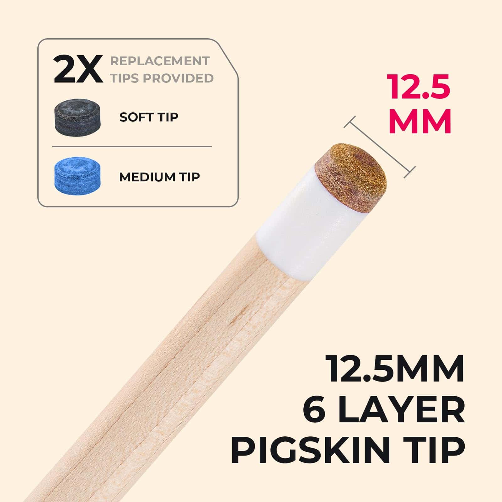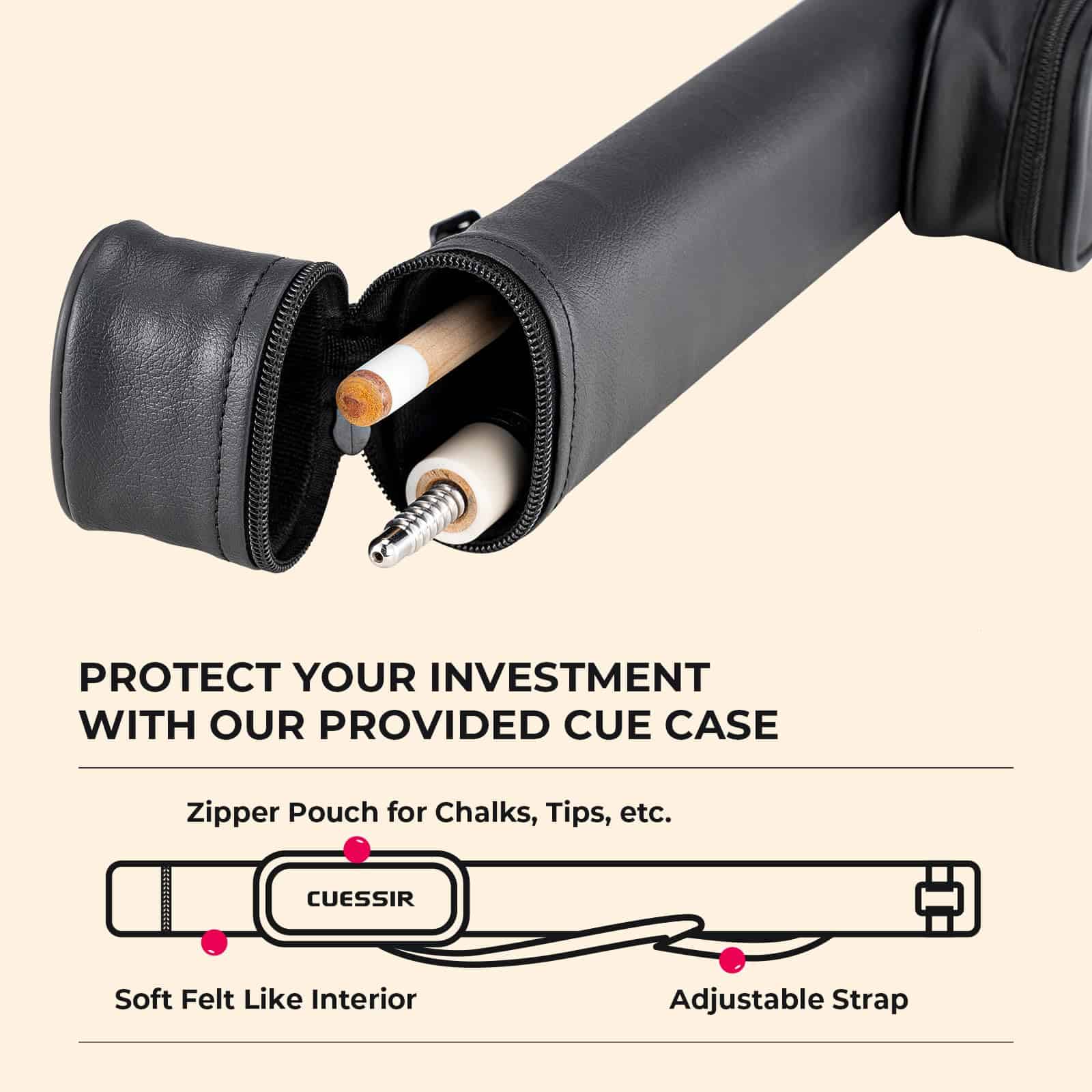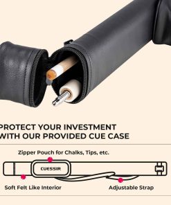 4. Estuche de Palito y Punta de Repuesto: El palito de billar CUESSIR viene con un estuche de palito protector, así como 2x puntas de repuesto. Los forros internos suaves del estuche de palito pueden proteger tu inversión y la correa se puede ajustar para un confort óptimo al transportar. Las 2 puntas de repuesto también vienen con diferentes durezas (media y suave) para adaptarse a tus diferentes necesidades.
