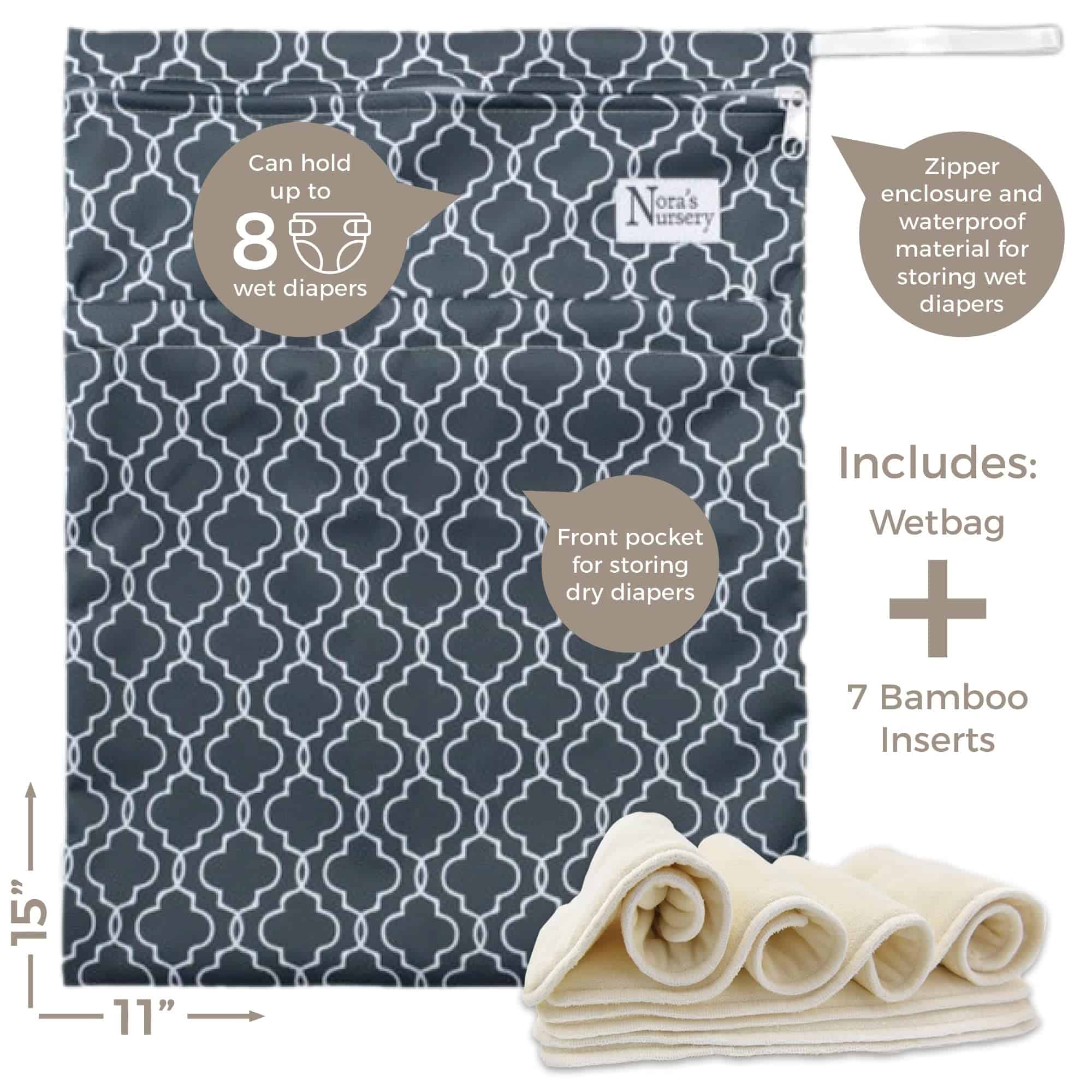 Nora’s Nursery se enorgullece de ofrecer este set de 15 piezas de nuestros elegantes, súper absorbentes, ecológicos, pañales de tela ajustables de gamuza con revestimiento de TPU e insertos híbridos de bambú/microfibra, ADEMÁS de una práctica bolsa húmeda/seca. El bolso almacena pañales frescos y secos en un práctico bolsillo exterior y pañales sucios y mojados dentro del compartimento principal impermeable con cremallera. Nuestros diseños unisex son perfectos para niñas o niños. Son un gran artículo para el registro de bebés o un regalo para un baby shower. Nuestros suaves y absorbentes insertos de pañal están hechos con 4 capas ecológicas de bambú poliéster/microfibra y se vuelven más suaves y MÁS ABSORBENTES con cada lavado. Las dos capas exteriores son de bambú para mantener la comodidad contra el trasero de tu bebé y las 2 capas internas son de microfibra para absorber la humedad y mantener la sequedad. Cada pañal viene con una serie de broches de tamaño fácilmente ajustable para que obtengas el ajuste adecuado para tu hijo. Nuestra tabla fácil de leer incluida hace que ajustar sea un JUEGO DE NIÑOS, y nuestros pañales se ajustan para crecer con tu hijo desde 10 hasta 33 libras. Así que, ya sea que tengas un niño alto y esbelto o un tot demasiado corto y robusto €” ¡te tenemos cubierto €” todos los días de la semana. Obtienes 7 pañales de bolsillo, 7 inserciones de bambú y la bolsa húmeda/seca de bonificación. ¡Haga clic en el botón ‘Agregar al carrito’ AHORA y los enviaremos inmediatamente!