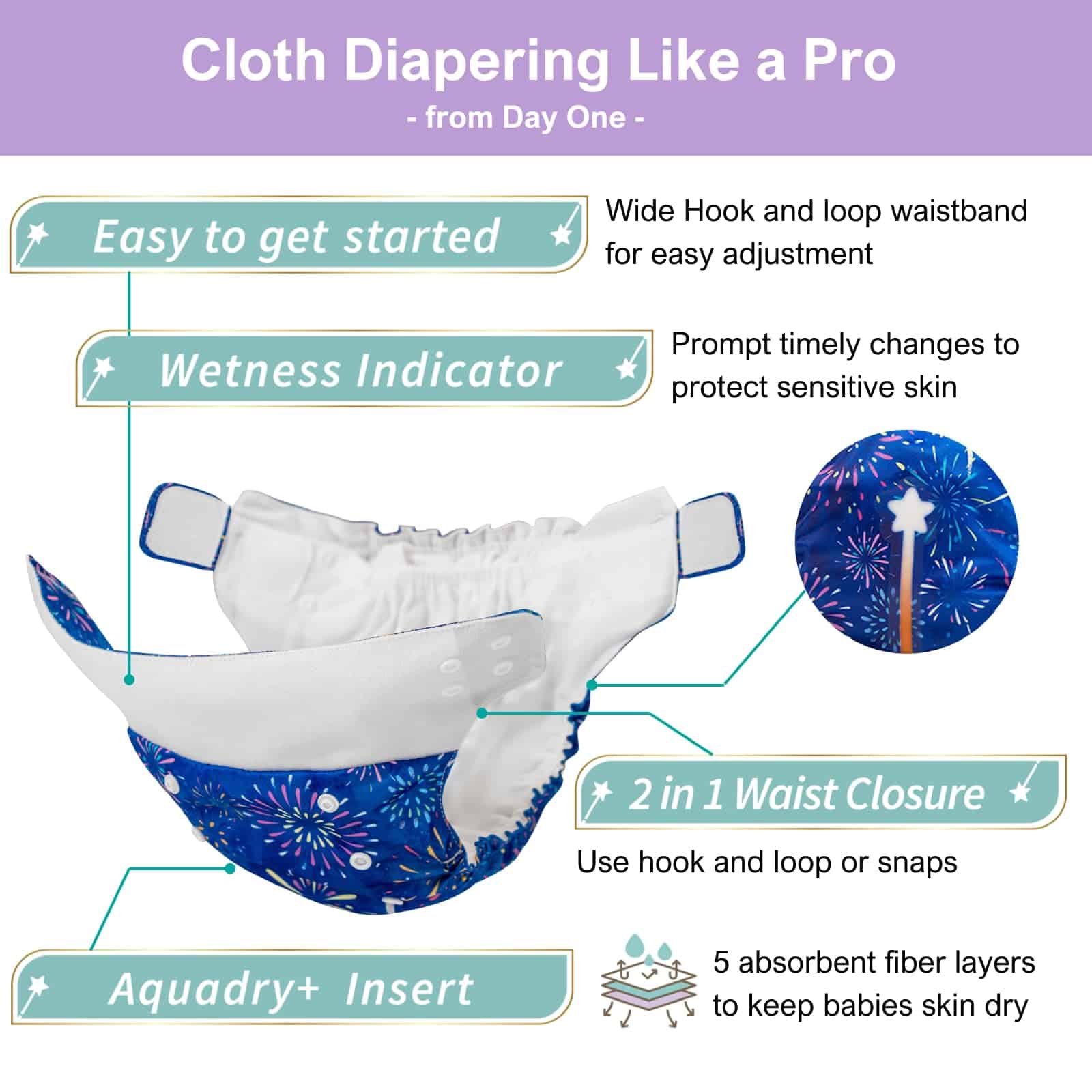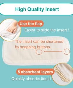 5. INSERTO AQUA-DRY+: 5 capas para mantener la parte inferior de su bebé seca y cómoda. La superficie absorbe rápidamente el líquido y controla el olor. La capa inferior proporciona una absorción rápida de hasta 4.05 oz (120 ml), brindando una protección casi a prueba de fugas, ¡y el diseño de bolsillo conveniente facilita la inserción!