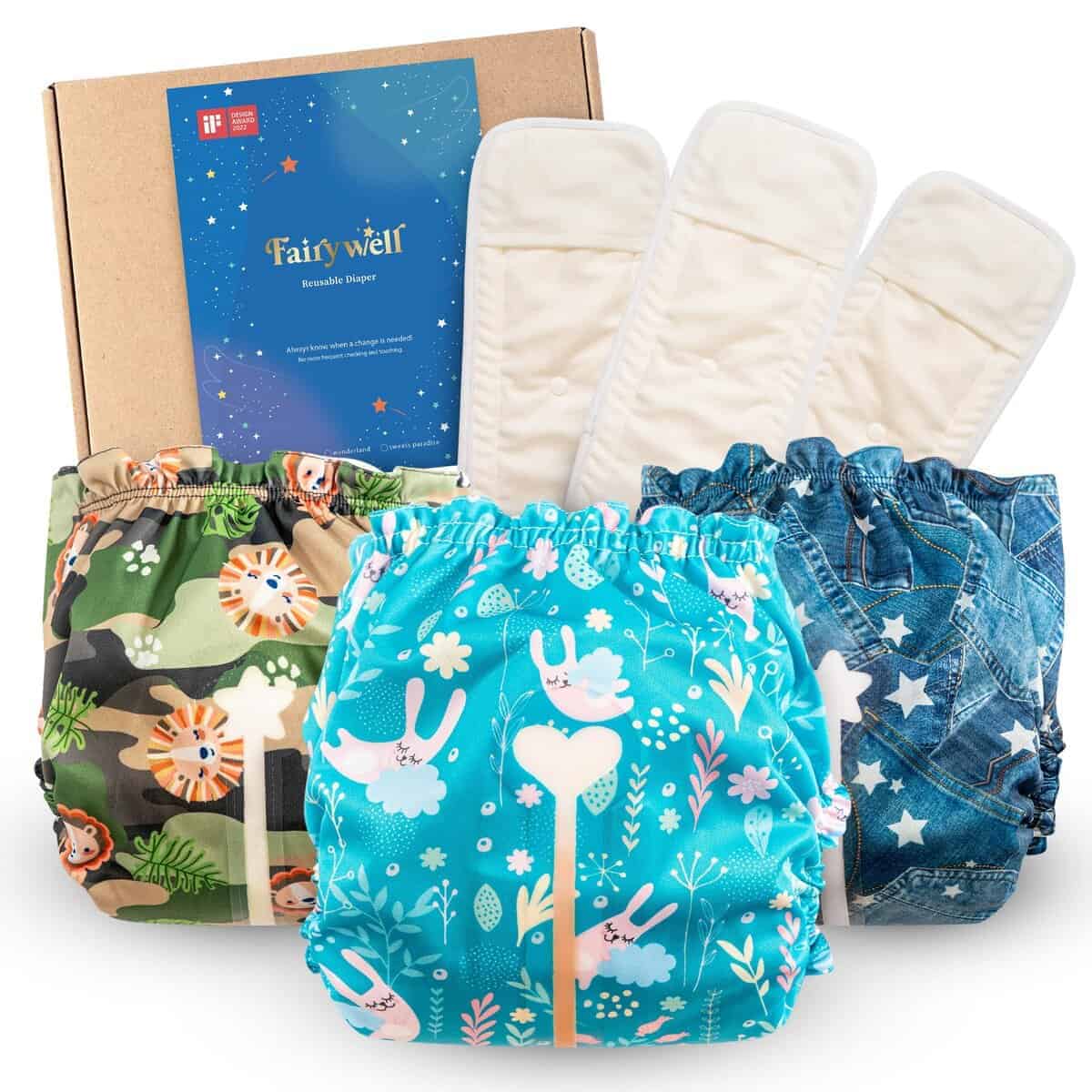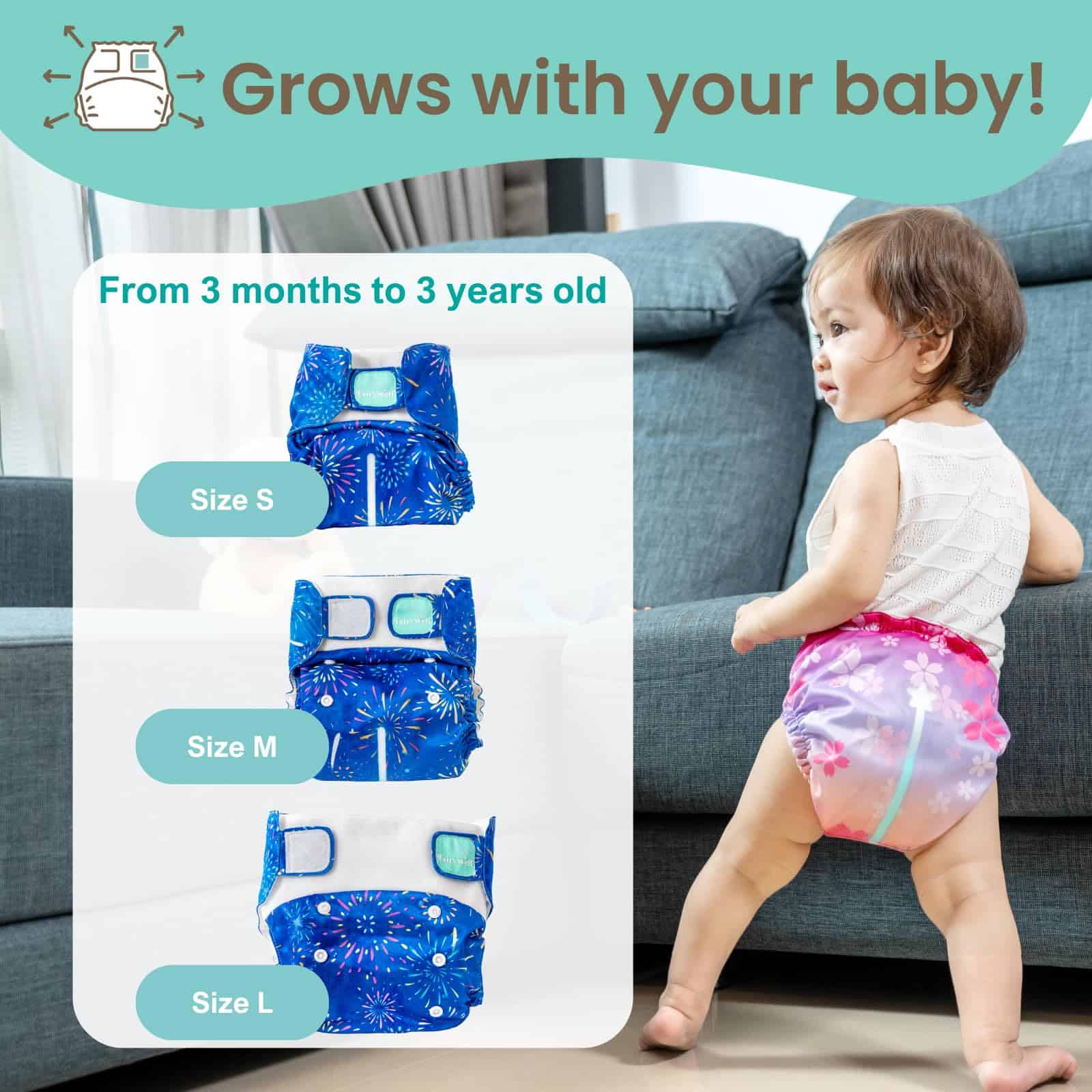 2. AJUSTE AJUSTABLE Y CÓMODO: ¡Los pañales Fairywell de talla única crecen con su hijo! Con un cierre suave de gancho y lazo para recién nacidos y botones seguros para niños activos, garantizan un ajuste seguro de 0 a 3 años (11-33 libras).