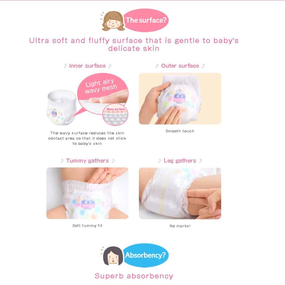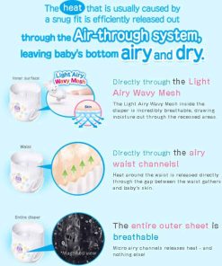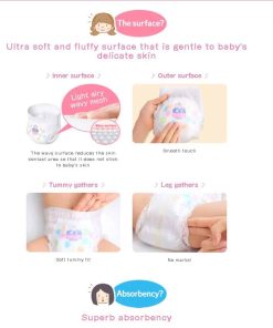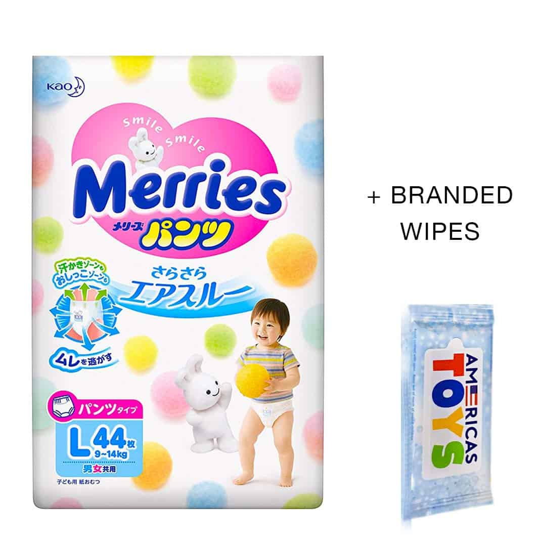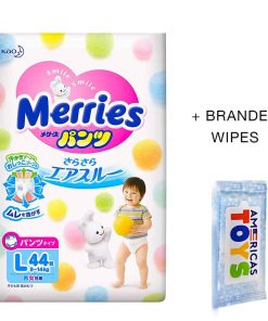 DESCRIPCIÓN INSPIRADA «Merries» proviene de la palabra inglesa «merry», que significa alegre y sonriente. También está inspirado en el móvil musical giratorio alegre colgado sobre la cuna de los bebés para hacerlos sonreír las 24 horas del día, los 365 días del año. Merries quiere que los bebés estén felices, cómodos y sonrientes. Creemos que los momentos felices que pasan juntos los bebés felices y los padres felices son vitales para el crecimiento y desarrollo del bebé. Merries innovará constantemente para ayudar a los padres a disfrutar de sus años de crianza y asegurar que sus bebés vivan tan felices y cómodamente como sea posible. CARACTERÃSTICAS: ¡NUEVA TECNOLOGÃA! Se estira 2.5 veces más en comparación con antes de estirarse (según la investigación de KAO). ¡Súper absorbente, altamente transpirable y ultra suave para que su bebé activo se mantenga seco y cómodo! ¡Absorbe instantáneamente y retiene la orina, dejando la superficie del pañal más seca para un uso más prolongado! Los polímeros en los pañales Merries pueden absorber hasta 200-300 veces el peso de líquido en relación con su peso. ¡Puede quedarse tranquilo incluso en las mañanas en las que su bebé ha orinado mucho durante la noche! ¡La superficie ondulada atrapa y retiene las heces! Las áreas hundidas de la sábana suave atrapan eficazmente las heces blandas y evitan que se dispersen. ¡Bloquee las fugas con dobles recolectores! El recolector lateral en 3D evita las fugas laterales. Los recolectores traseros para un ajuste ceñido ayudan a evitar las fugas para las tallas S, M, L, XL. ¡Cuando las tiras cambian de color a azul oscuro, es hora de cambiar el pañal! No hay diseño alrededor de las tiras, lo que facilita ver cuando cambia el color. Las esquinas están redondeadas y hechas de un material suave que es suave y no raspa la piel del bebé. ¡Y el sello reutilizable es tan conveniente! ¡Recolectores alrededor de las piernas! ¡Se ajusta perfectamente alrededor de las piernas del bebé! Se ajusta cómodamente en todas las posiciones, se estira suavemente alrededor de la cintura de su bebé. ¡Sin marcas rojas o abrasiones en el área de la entrepierna!
