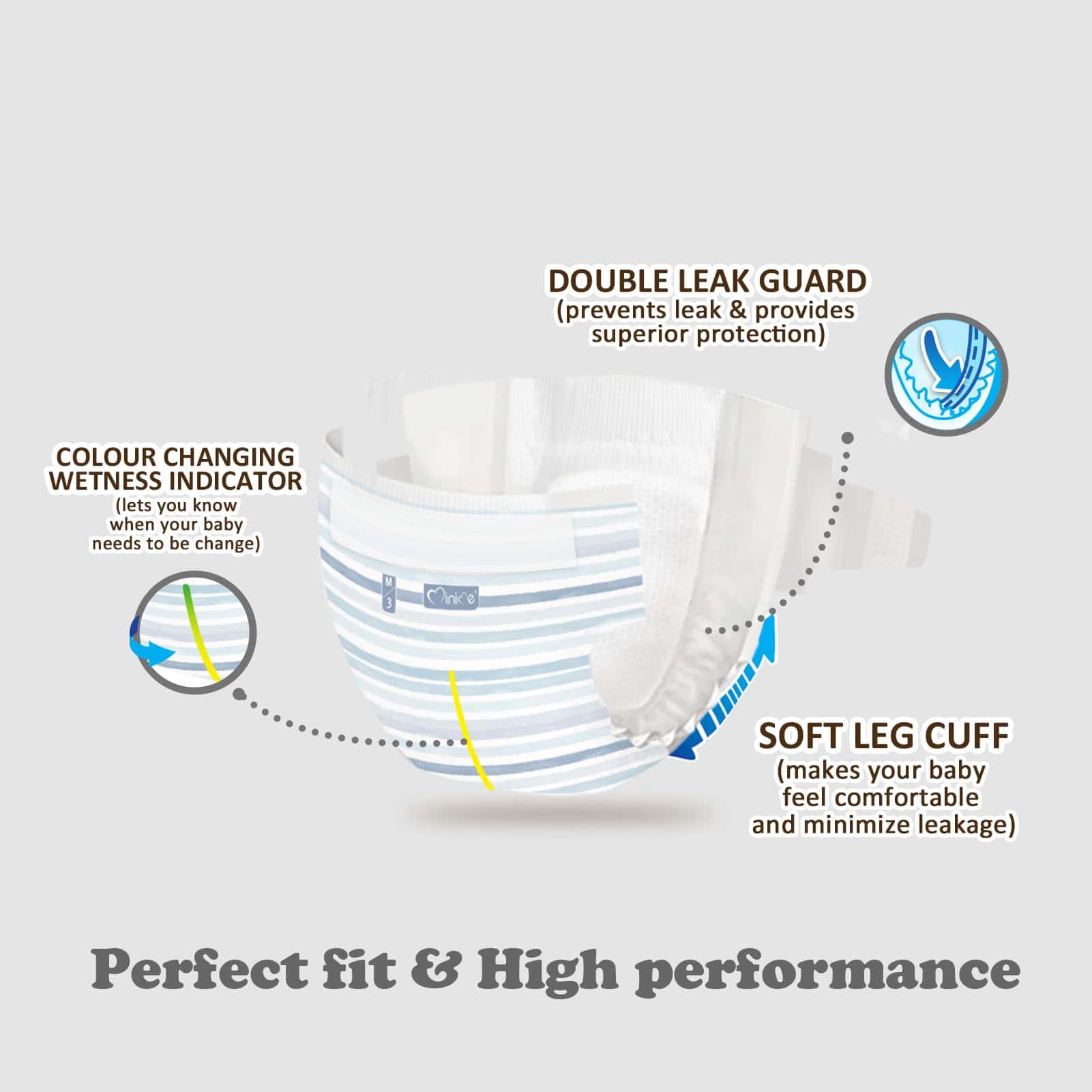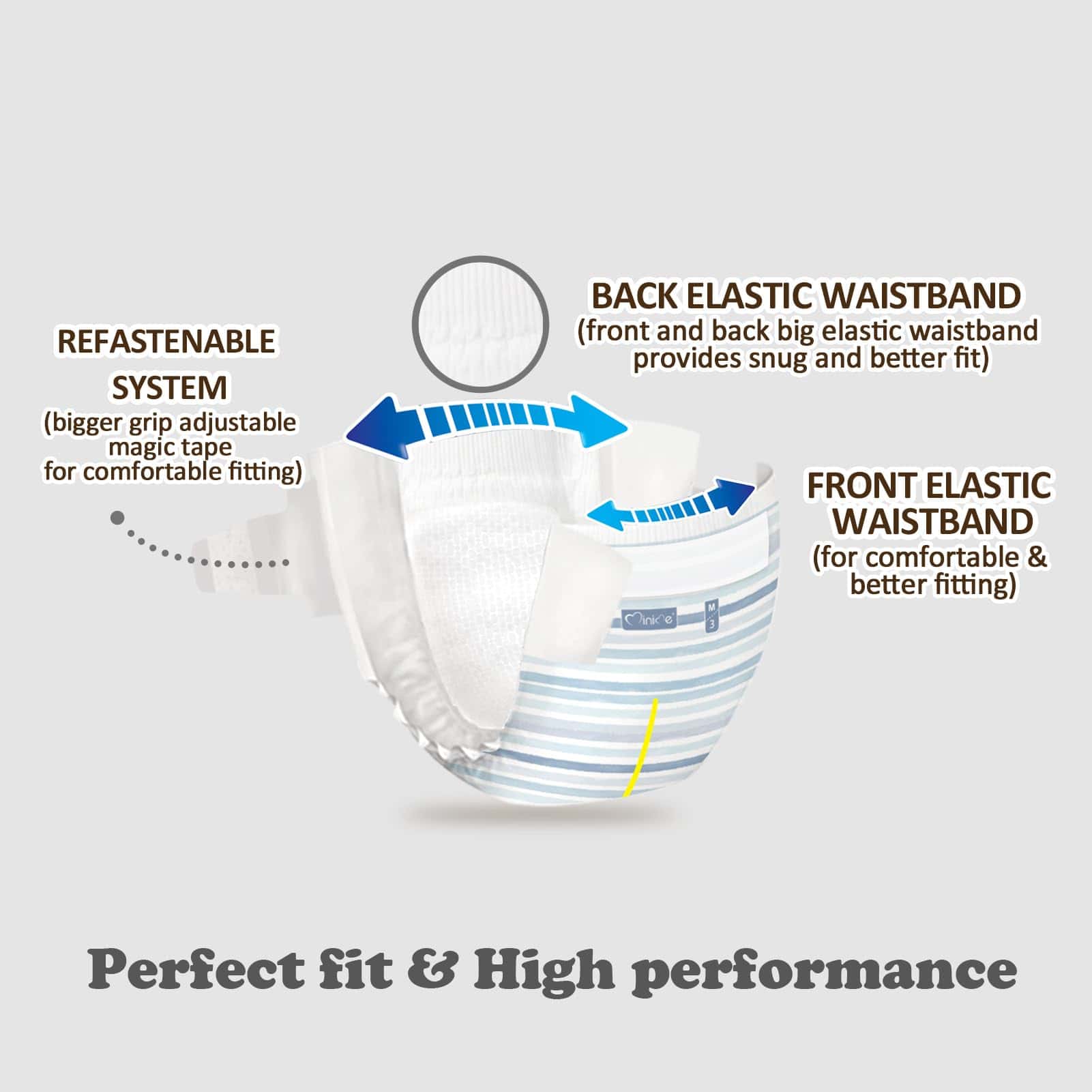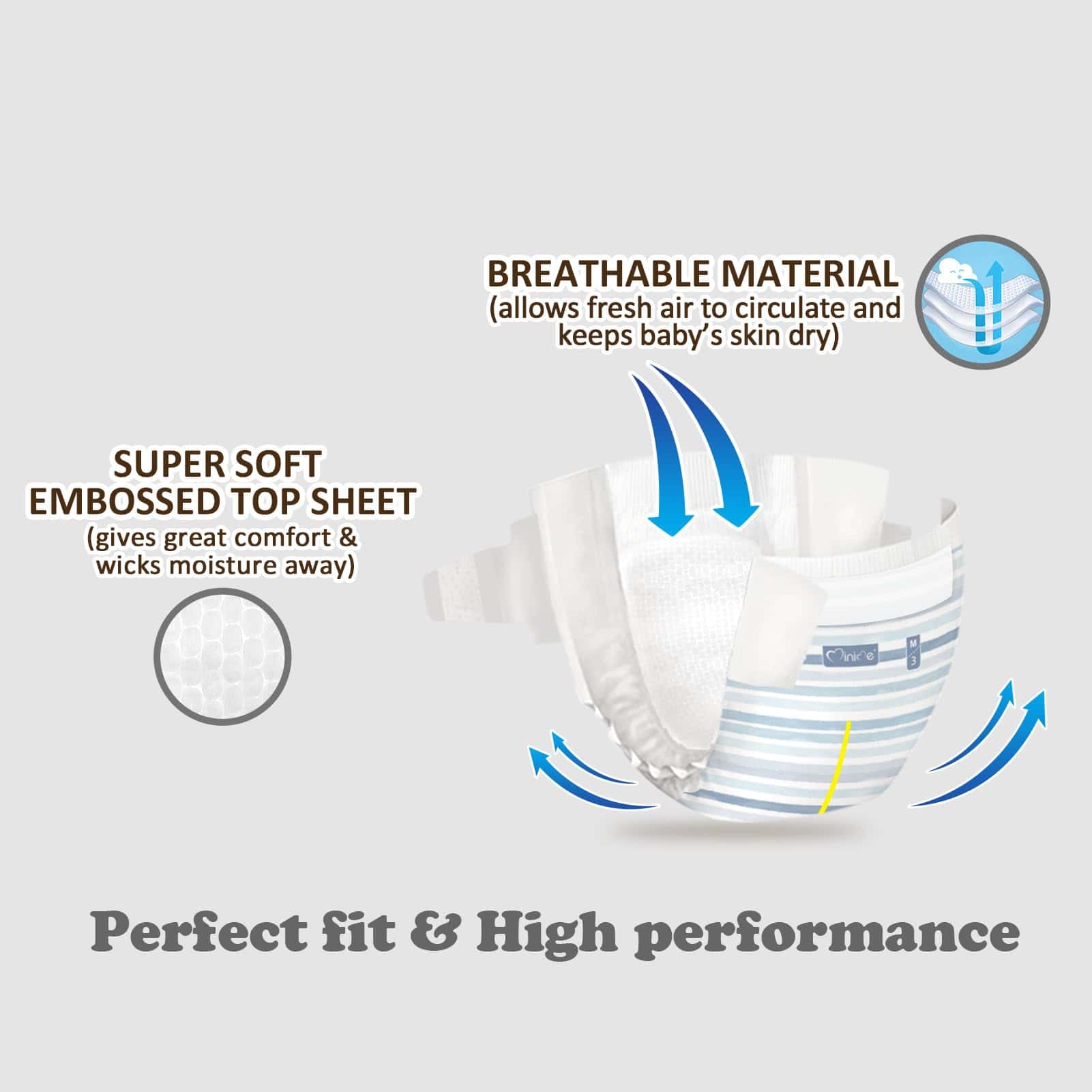 Los pañales para bebé Minime Premium han sido elaborados con cuidado, basándonos en nuestra comprensión como padres de la importancia primordial de la prevención de fugas y la comodidad. Hemos experimentado esas situaciones desordenadas de primera mano y sabemos que es mejor evitarlas. Nuestros pañales están diseñados cuidadosamente con ingredientes de los que nos sentimos orgullosos, asegurando que sean suaves en la piel delicada y, al mismo tiempo, respetuosos con el medio ambiente. Hemos priorizado la calidad sin comprometer la asequibilidad. Con un diseño premium que incluye bordes de pierna gruesos para una protección superior contra fugas y un núcleo avanzado que elimina rápidamente la humedad, nuestros pañales ayudan a minimizar la irritación. Mantienen un ajuste ceñido incluso cuando están sucios, reduciendo la caída y garantizando una experiencia segura y cómoda para su pequeño.