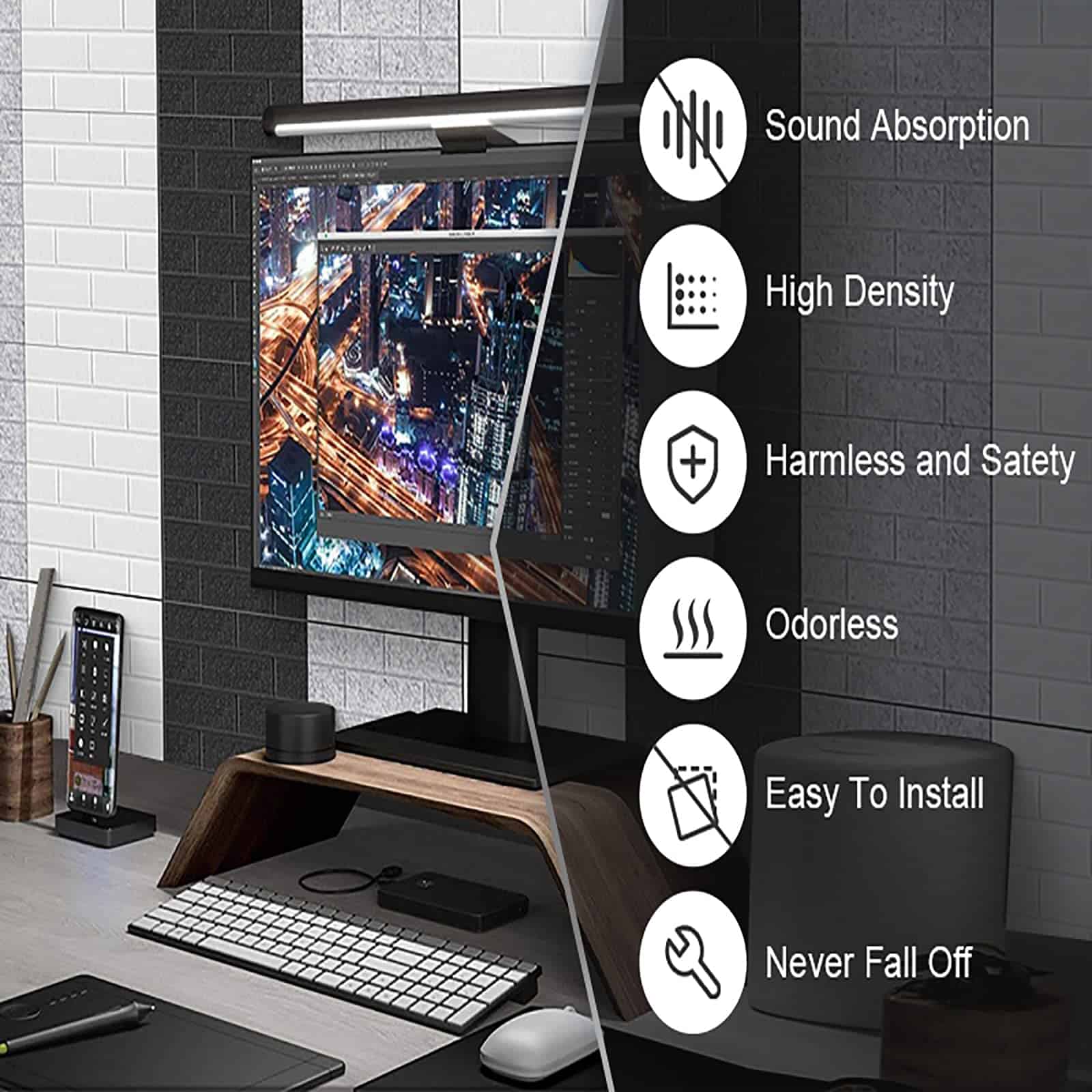 1. PANELES ACÚSTICOS CON PATRÓN DE LADRILLO MEJORADO: Estos paneles absorbentes de sonido actualizados, con un diseño único que combina patrones de ladrillo y cuadrados, se pueden cortar fácilmente en el tamaño y forma que desee. Con múltiples opciones de color y métodos de ensamblaje para satisfacer sus diversas ideas para paredes DIY, esto no afectará el rendimiento y efecto del panel para absorber ruido y eliminar el eco, también juega un papel en decorar y proteger la pared.