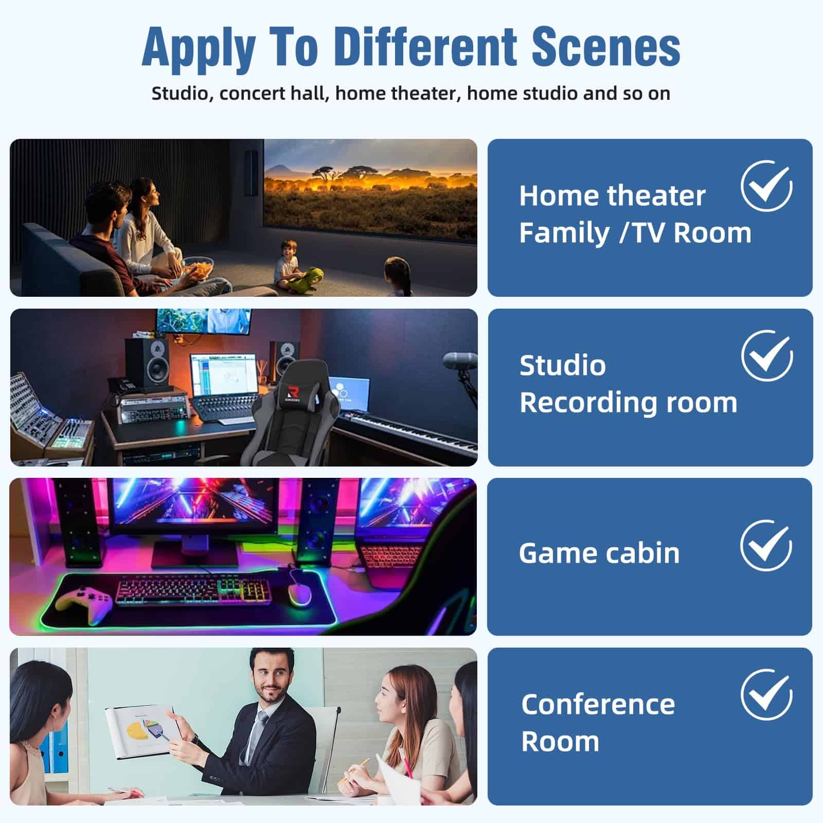 4. Estos paneles absorbentes de ruido son ideales para tratar puntos específicos en estudios de producción, salas de práctica, teatros o cines, y otros lugares concurridos y ruidosos como gimnasios, subterráneos, estaciones, oficinas, escuelas, etc.