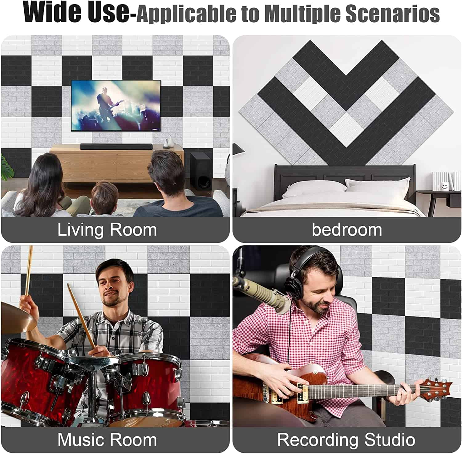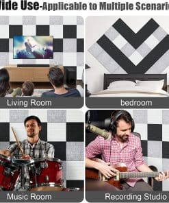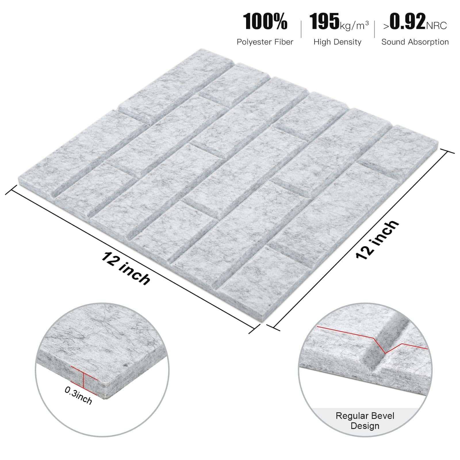 Panel acústico Tutmyrea de 18 piezas, tamaño 12 X 12 X 0.4 pulgadas, diseñado para mejorar la calidad del sonido y el ambiente acústico en su hogar, estudio o estudio de grabación. Los paneles cuentan con un patrón de ladrillo actualizado que combina ladrillos y cuadrados, lo que permite cortarlos en la forma y tamaño que desee. Fabricado con fibra de poliéster de alta calidad, la densidad del panel es de 195kg/m3, con un coeficiente general de reducción de ruido (NRC) de 0.92. Además, la resistencia a la abrasión y el impacto garantizan un rendimiento duradero. El panel autoadhesivo hace que la instalación sea rápida y sencilla, simplemente determine la ubicación y péguela a la pared, techo o puerta en segundos. La amplia aplicación de estos paneles los hace ideales para su uso en entornos como estudios de grabación, salas de cine en casa, dormitorios y salas de juegos, donde se necesita una mejora en la calidad del sonido y la reducción del ruido. Además de su funcionalidad, estos paneles también sirven como elementos decorativos, agregando un toque moderno y estético a cualquier espacio.