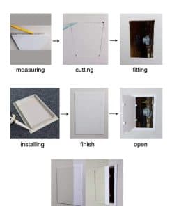 Por lo general, los paneles de acceso se instalan durante la construcción inicial de una casa o edificio comercial. Pero a menudo, debido a renovaciones de fontanería, eléctricas o HVAC, se deben instalar nuevas puertas de acceso para proporcionar a los electricistas, fontaneros o técnicos de HVAC un acceso conveniente a los sistemas ocultos. Son fáciles de instalar simplemente aplicando un adhesivo de calafateo en la parte posterior del marco y presionándolo en su lugar. El plástico de alto impacto con estabilizadores UV no se desvanecerá ni corroerá. La puerta con bisagras es completamente extraíble del marco. (Nota: solo el panel de acceso, no incluye adhesivo). Cómo instalar 1. Medición: Use una plantilla para ayudar a los instaladores a medir el agujero. (El panel de acceso viene sin plantilla) 2. Corte: Para cortar paneles de yeso, necesitará una sierra de jab. Para cortar alrededor de su contorno, puede empujar la sierra de jab a través del panel de yeso existente o crear agujeros guía con un taladro. 3. Lijado: Una vez que haya cortado los agujeros, es importante lijar los bordes. Esto garantizará que su marco se ajuste de manera segura en el agujero. 4. Anclar el marco: Use adhesivo (adhesivo preparado por usted mismo) para unir el marco de manera segura y completar la instalación.