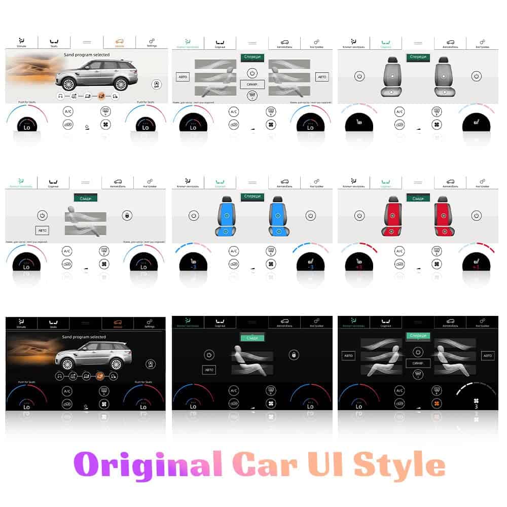 Funciones originales del automóvil compatibles – El menú de pantalla Sharp UI original ofrece una interfaz familiar y fácil de usar que es compatible con las funciones originales del automóvil, incluidas las funciones de aire acondicionado, enfriamiento, calefacción, control del aire acondicionado de los asientos traseros del automóvil, luces de ambiente y más.