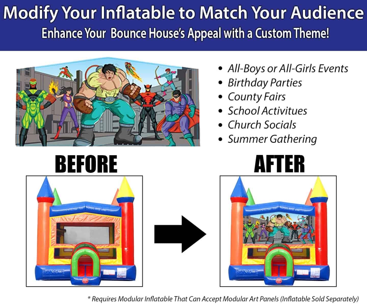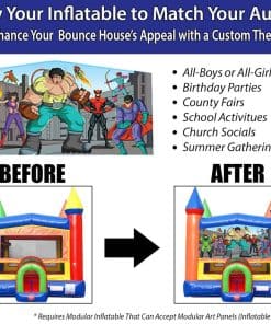 Nuestros divertidos Paneles de Arte Modulares son una excelente manera de vestir su Brincolín Modular Comercial, Combo de Brincolín Resbaladilla o Resbaladilla de Agua. Con un montón de opciones para elegir, puede personalizar el tema de su inflable para cualquier evento especial, rango de edad o grupo. El panel en sí mide 10.3 pies de ancho por 5 pies de alto y se sujeta firmemente a su brincolín con un respaldo de cinta adhesiva de gancho y lazo. Construidos con material de vinilo de grado comercial, estos coloridos Paneles de Arte Modulares harán que su brincolín inflable se destaque entre la multitud. Son fáciles de almacenar para que esté listo para la fiesta en cualquier ocasión. ¿Un evento solo para chicos? ¿Qué tal nuestro tema Pirata? ¿Qué tal un tema de Princesa para tu próxima fiesta solo para chicas? ¿Necesitas algo más neutral en cuanto a género y de amplio atractivo? ¡Hay tantas opciones para elegir! Características: – Hecho de nuestro duradero vinilo para resistencia y durabilidad – Se adapta a la mayoría de los inflables modulares de 13 pies de ancho – Se sujeta de forma segura con respaldo de cinta adhesiva de gancho y lazo – Más de 30 opciones para elegir y personalizar su brincolín, combo de brincolín/resbaladilla o resbaladilla de agua para cualquier evento, edad o tema. Incluye – Un panel temático de 10.3′ x 5′.