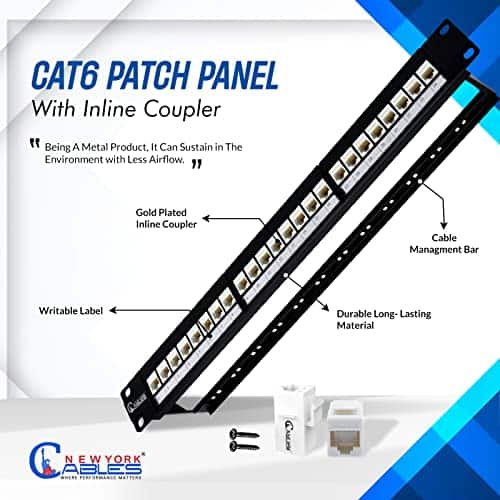 Panel de Conexión de 24 Puertos Si tu red doméstica o red de oficina tiene cables de ethernet enredados en nudos imposibles de desatar, necesitas este panel de conexión. Diseñado y fabricado por NewYork Cables, este es un panel de conexión de 24 puertos con acoples de ethernet en línea compatibles con cables ethernet Cat5e, Cat6 y Cat6a. Limpia toda tu red y también facilita la gestión, instalación y mantenimiento de tu red LAN cableada. Rentable, Ahorrador de Tiempo Este panel de conexión de ethernet está hecho de metal sólido y presenta un diseño resistente. En la red LAN, ofrece una solución fácil de gestión de cables y reduce el desorden en tu sala de servidores. Una red bien gestionada también significa cables de ethernet eternos y gran valor por tu dinero a largo plazo. Sin mencionar la tranquilidad y los beneficios estéticos de usar este dispositivo de desorden. LAN Limpia y Eficiente Este panel de conexión te ayuda a ordenar tu red cableada sin tener que crimpar o punzonar conectores keystone. Los acoples de ethernet en línea vienen precargados para tu conveniencia. Simplemente inserta tus cables ethernet en ambos extremos y listo. Fácil de Usar y Mantener El panel de conexión de ethernet de 24 puertos es fácil de mantener. Simplemente móntalo en un rack o en una pared, funciona con ambos tipos de mecanismos de montaje. Se envía con todas las herramientas necesarias que necesitas, lo que se traduce en un procedimiento de instalación sin problemas. Todo lo que necesitas hacer es conectar tus cables ethernet Cat6, Cat5e o Cat6a en ambos extremos utilizando conectores RJ45 8p8c. Diseño Inteligente El diseño general de este panel de conexión de ethernet es resistente y robusto. El material es metal sólido y está coloreado de negro. Además, tiene un acabado premium que le da un aspecto y sensación elegante y de alta gama. También se incluye en el paquete una barra trasera que mantiene la tensión de los cables y los protege. La barra trasera es desmontable y puedes quitarla si tus cables no necesitan un soporte adicional. Recomendamos usarlo de todos modos.