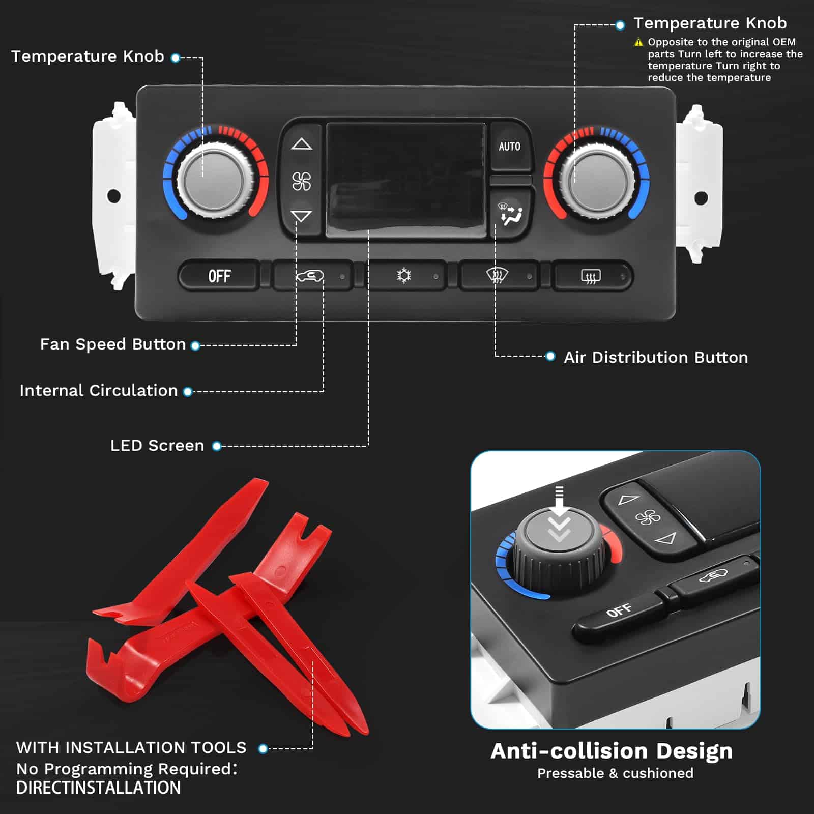 2. Compatibilidad con Vehículos: Módulo de control de clima con temperatura dual compatible con GMC 2003-2004 Sierra 1500, 2003 Sierra 1500HD, 2003-2004 Sierra 2500 Sierra 2500HD, 2003-2004 Sierra 3500, 2003-2004 Yukon, 2003-2004 Yukon XL 1500, 2003-2004 Yukon XL 2500 (¡SOLO SE AJUSTA a longitudes de cama de camioneta larga o estándar).