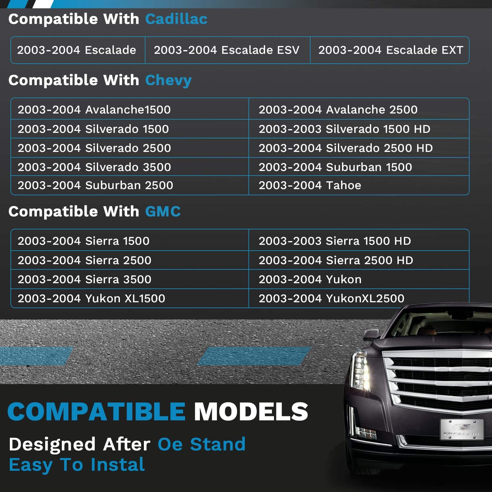 1. Compatibilidad con Vehículos: El panel de control del interruptor de clima A/C con perilla de control es compatible con 2003-2004 Cadillac Escalade Escalade ESV Escalade EXT; Compatible con Chevy Chevrolet 2003 Avalanche 1500 2500, 2003-2004 Silverado 1500, 2003 Silverado 1500HD, 2003-2004 Silverado 2500 Silverado 2500 HD, 2003-2004 Silverado 3500, 2003-2004 Suburban 1500 2500, 2003-2004 Tahoe (¡SOLO SE AJUSTA a longitudes de cama de camioneta larga o estándar).