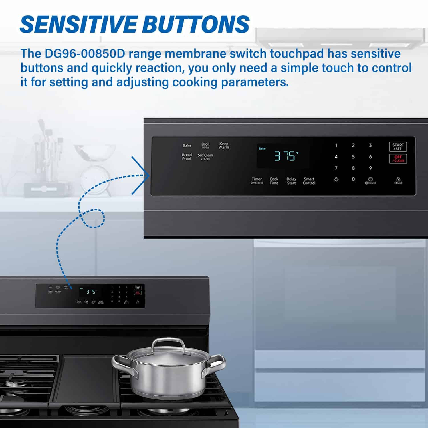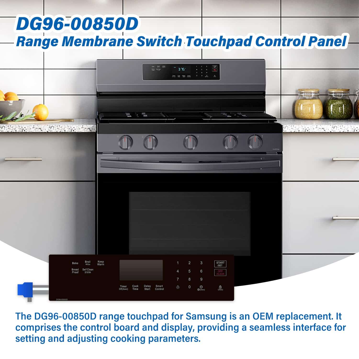 3. Compatible con El panel táctil de membrana de interruptor de rango DG96-00850D compatible con la gama de gas Samsung: NX60A6311SG/AA-00, NX60A6311SG/AA-01, NX60A6311SG/AA-02, NX60A6311SS/AA-00.