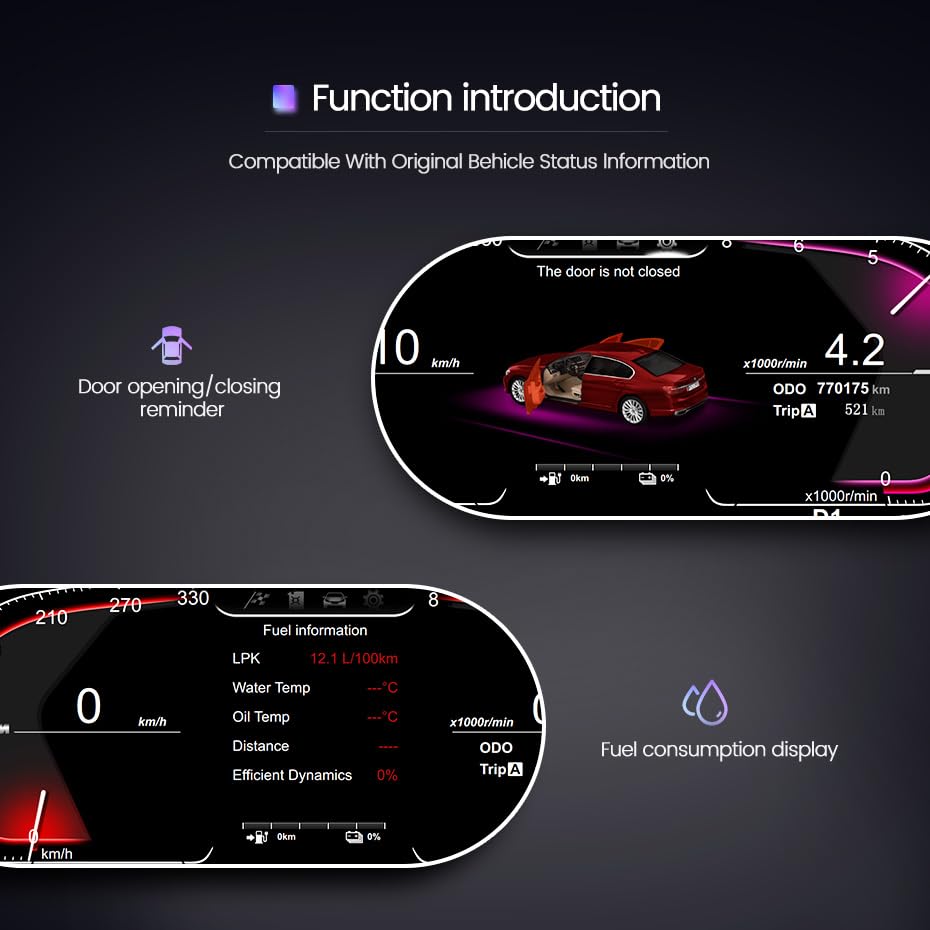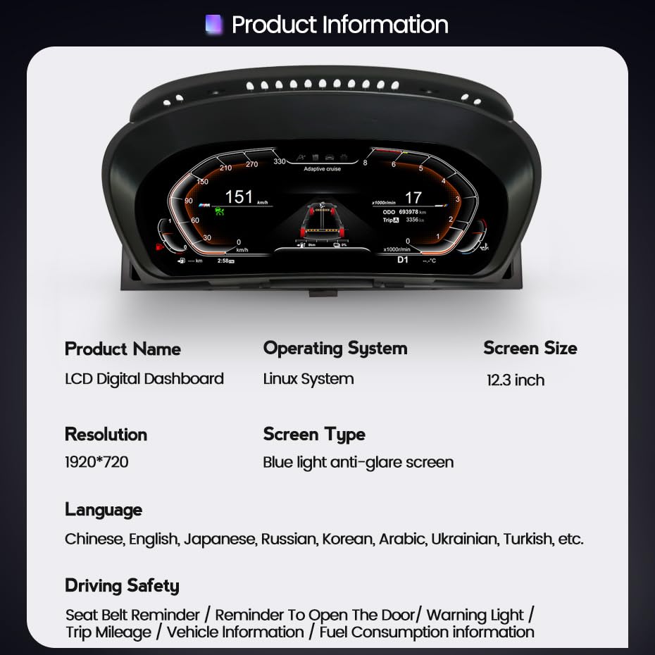 Panel de instrumentos digital de 12.3 pulgadas diseñado para adaptarse a BMW X6 E71 E72 2007-2013. Este panel de instrumentos virtual y pantalla de velocidad es compatible con el sistema CCC CIC de su vehículo. Con una pantalla HD IPS de 12.3 pulgadas y una resolución de 1920×720, este panel de instrumentos ofrece una visualización nítida y clara de la información. El procesador T5 1.5Ghz y el sistema operativo Linux aseguran un rendimiento rápido y estable. Además, el panel de instrumentos admite varios idiomas, incluidos Chino, Inglés, Español, Alemán, Ruso, Turco, Coreano, Francés, Italiano y Japonés. Este panel de instrumentos no solo ofrece una amplia gama de funciones inteligentes, como reproductor de velocidad original, temperatura del aceite/agua, presión del aceite, consumo de combustible y función de crucero, sino que también presenta una interfaz fresca y elegante que se adapta perfectamente a las preferencias personalizadas de los propietarios. Con todas las funciones de control del volante originales intactas, cambiar canciones, canales y ajustar el volumen es fácil y conveniente. El kit de instalación viene completo con arnés de cables, marco y unidad de tablero, lo que facilita la instalación plug and play sin necesidad de cortar o modificar cables. Además, aoonav ofrece un soporte técnico profesional y un servicio al cliente de alta calidad para resolver cualquier problema que pueda surgir durante la instalación o el uso. Asegúrese de mejorar su experiencia de conducción con este panel de instrumentos de alta calidad y rendimiento para su BMW X6 E71 E72.