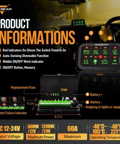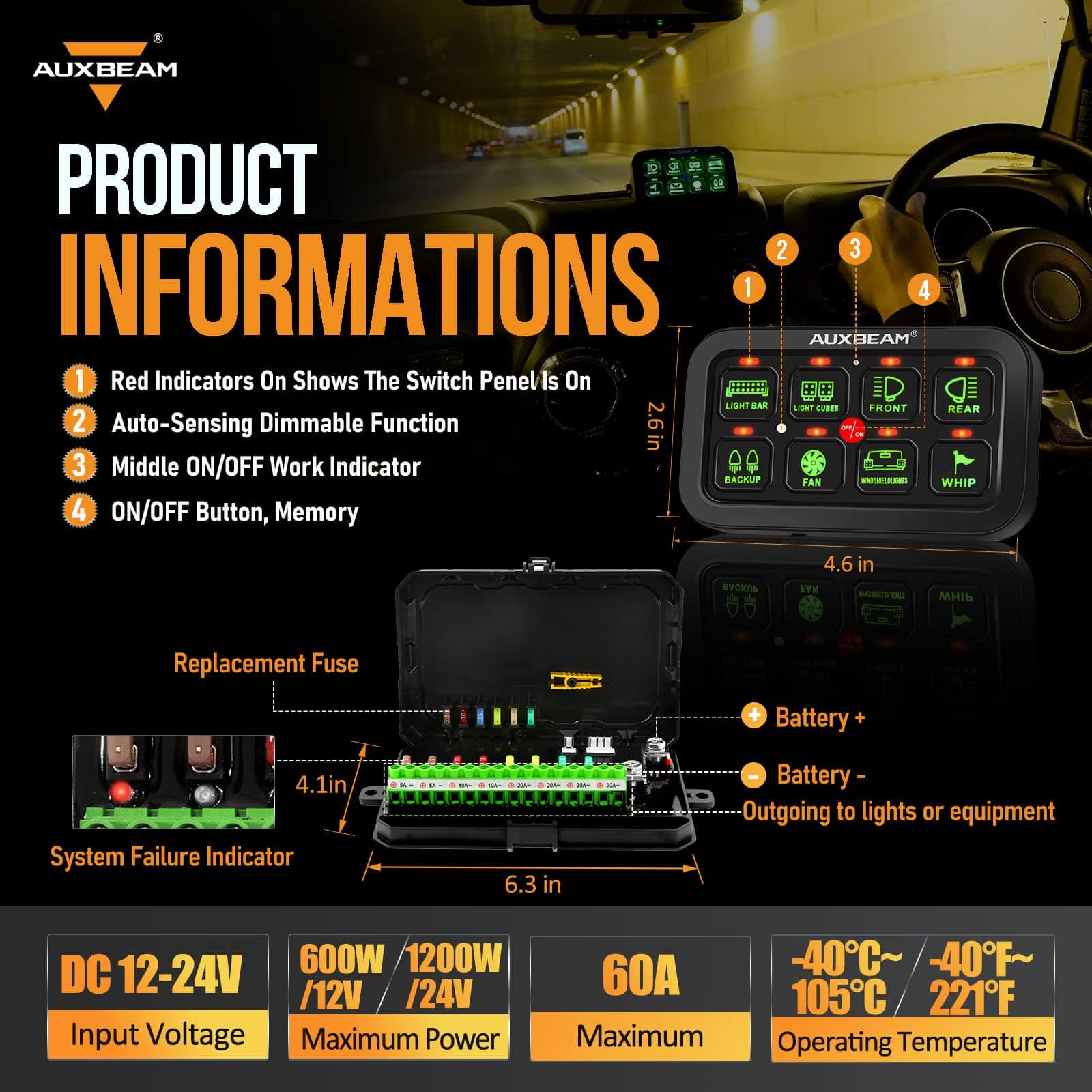 El Panel de Interruptores Auxbeam 8 Gang GA80 es una solución práctica y versátil para controlar múltiples accesorios electrónicos en su vehículo. Con una capacidad máxima de corriente de 60A y una clasificación de voltaje de 12V / 24V, este panel proporciona una potencia máxima de 600W a 12V y 1200W a 24V. La función de atenuación automática ajusta el brillo del panel de interruptores según la luminosidad ambiente, garantizando una visibilidad óptima en todo momento. Además, la incorporación de relés de estado sólido internos brinda protección contra sobretensiones, inversión de polaridad, sobrecorriente y sobrecalentamiento, asegurando un funcionamiento seguro de todos los accesorios conectados. La instalación es rápida y sencilla gracias al arnés de cableado plug & play y los soportes de montaje versátiles. Con 60 etiquetas autoadhesivas personalizables, puede organizar y controlar sus accesorios de manera conveniente. Este panel de interruptores compacto y multifuncional es ideal para una amplia gama de aplicaciones, como camiones, barcos, vehículos todo terreno, vehículos recreativos, embarcaciones, motos de nieve, vehículos todoterreno, SUV, automóviles, autobuses y equipos pesados. Disfrute de la tranquilidad que ofrece la garantía de 12 meses, que cubre la sustitución gratuita de cualquier problema de calidad no derivado de causas humanas.