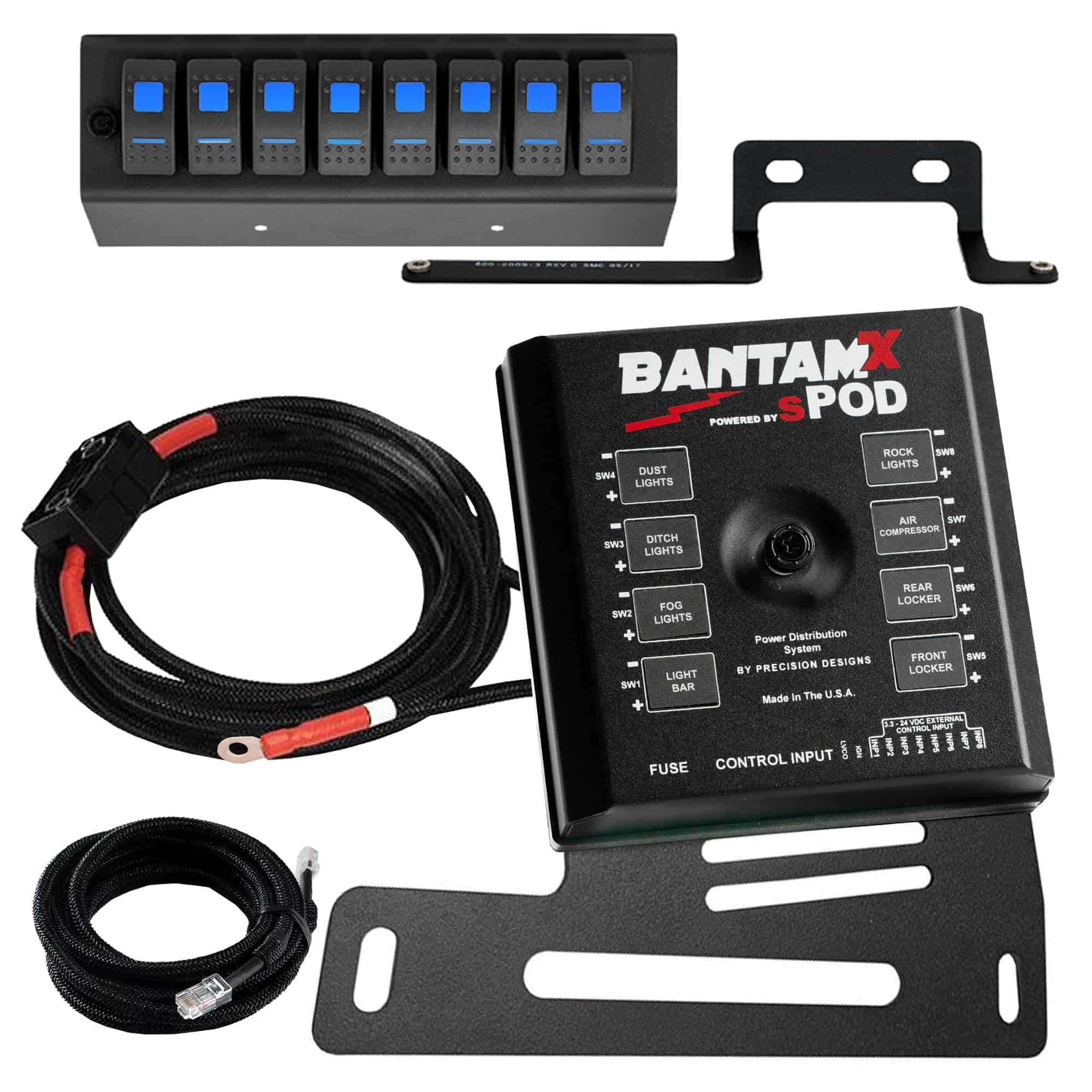 ¡El BantamX ahorrará horas de tiempo de cableado e instalación! Es un pequeño sistema de control de 8 circuitos (expandible) que proporciona una forma limpia (¡un cable Ethernet a la cabina!) y segura de alimentar y controlar accesorios de 12/24VDC. ¡Debido al pequeño tamaño del BantamX, las opciones de colocación son infinitas! Sin cortes, sin pescar cables en la cabina ni conectar al sistema eléctrico del vehículo. ¡Es la solución perfecta en general para todos sus accesorios eléctricos de posventa con opciones incomparables por cualquier otra persona! Características: Sistema digital totalmente programable y controlado 8 circuitos con capacidad para 30 amperios a 12.5 VDC por circuito Bloque terminal de 16 posiciones (acople fácil de accesorios) 2 puertos de controlador (RJ45) para cables Ethernet Corte de baja tensión integrado (LVCO) Protección de batería con anulación opcional Fusible mini ATM para protección y reinicio de LVCO Sistema de protección contra fallos autosanadores (de 1.5 a 30 amperios) MOSFET sensibles a la corriente controlados por un microprocesador (sin fusibles ni relés) Disyuntor de circuito de 50 amperios auto-reiniciante Cables de batería trenzados de nailon son alambre de cobre cruzado de alta calidad con chaqueta de silicona Opera a 12VDC o 24VDC Bloque terminal de entrada de 8 posiciones para controlar salidas Capacidades Bluetooth incorporadas para control remoto Protección contra: sobrecalentamiento, sobrecorriente, cortocircuitos, polaridad inversa y colapso de campo Control de encendido y bloqueo de seguridad para interruptores 1 y 2 (opcional) Hasta 4 unidades BantamX pueden conectarse en cadena y ser controladas por una pantalla táctil Actualizaciones/software inalámbricas a pedido Se adapta a: 2009-2018 Jeep Wrangler JK Hardware: Base de acero con recubrimiento en polvo con herrajes incorporados Junta de silicona para impermeabilización Tapa de aluminio Opciones de montaje específicas para vehículos Opciones de montaje específicas para vehículos Base y cubierta aisladas robustas Características disponibles a través de la aplicación móvil sPOD (gratuita): Cada interruptor puede programarse para: Atenuando Flash estroboscópico Flash momentáneo Enlace de interruptores Modo de operación en carretera y todoterreno Las siguientes funciones solo están disponibles a través de la compra de nuestra aplicación Pro-Series: Temporizadores de circuito Bloqueo de interruptores Corriente de arranque inicial para cada circuito se eleva a 65 amperios por 5 segundos Programar cualquier circuito para estar siempre encendido mientras se mantiene la protección contra fallas Opción para desactivar el modo de suspensión profunda Reinicio automático seleccionable después de que el circuito se apaga por sobrecorriente/cortocircuito Limitación de corriente programable (en incrementos de 2 amperios hasta 30 amperios) Reinicio automático seleccionable para apagar la limitación de corriente Acciones de traba o momentáneas seleccionables para entradas Control de encendido programable para los 8 circuitos Función de estroboscopio variable para crear patrones personalizados de destellos/estroboscopios Opciones de controlador externo (no incluido con el sistema y solo se puede utilizar en conjunto con un controlador sPOD): Interruptores de terceros Computadoras Arduino Raspberry Pi Sistemas de audio de Alpine Controladores de sensores, termostatos, interruptores de presión, controladores de ventiladores y más Panel de interruptores: Panel de interruptores con ocho interruptores LED Blue dobles iluminados (instalados y pre-cableados) Todos los cables están envueltos en una funda trenzada de nailon resistente a altas temperaturas. Viene con un cable Ethernet CAT-6 de 10 pies, se puede extender hasta 25 pies desde el BantamX Cada interruptor tiene 2 modos programables: estroboscópico o flash Paneles de aluminio son formados, soldados y recubiertos de polvo Interruptores de la tecnología Carling Contura (certificados a IP66/68 – ambiente marino/hostil) Luz piloto inferior controlada (botón pulsador) Los interruptores de roca grabados con láser están disponibles Capacidad para conectar en cadena paneles para operaciones remotas (es decir: panel en la cabina y panel en la parte trasera del camión) Apagado seguro automático del sistema cuando se desconecta el panel Se puede utilizar junto con otro panel de 8 interruptores, HD y pantalla táctil Dos puertos RJ45 disponibles integrados en el controlador CAN-Bus