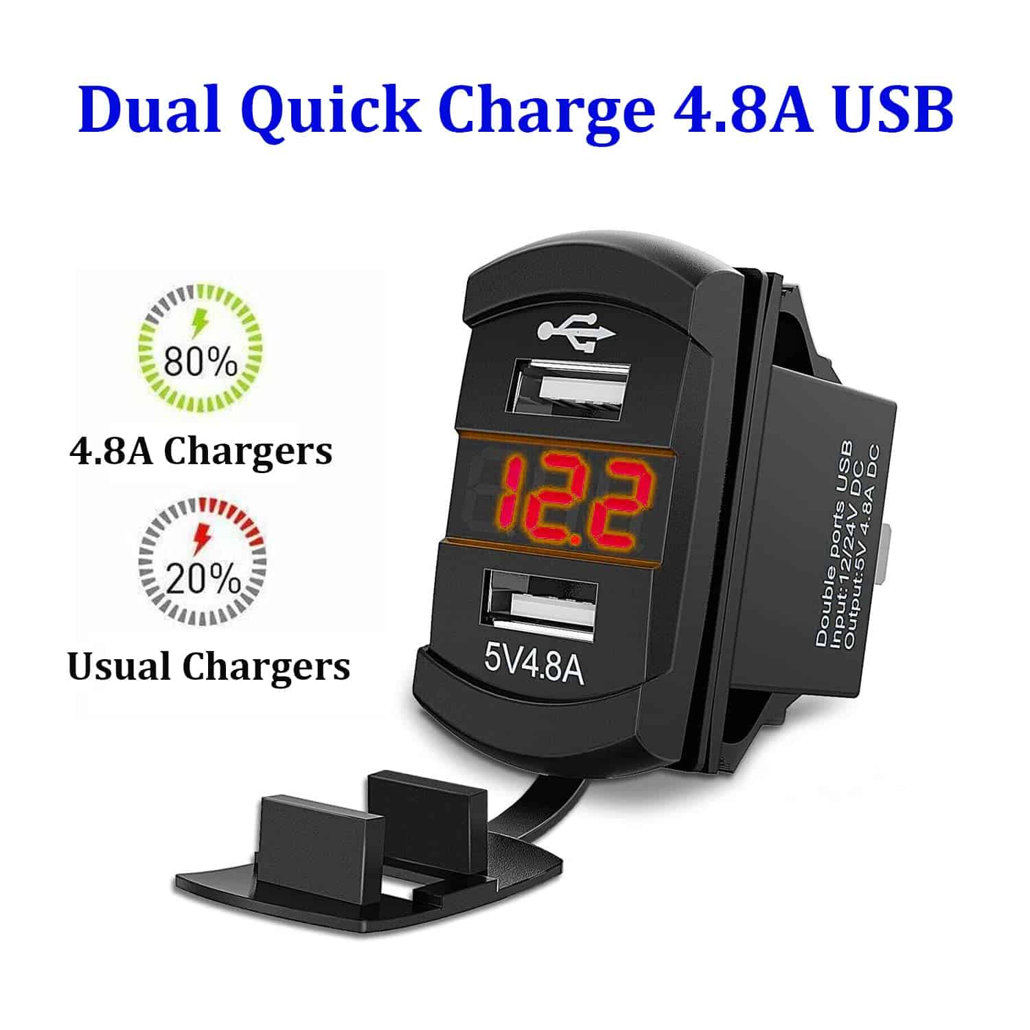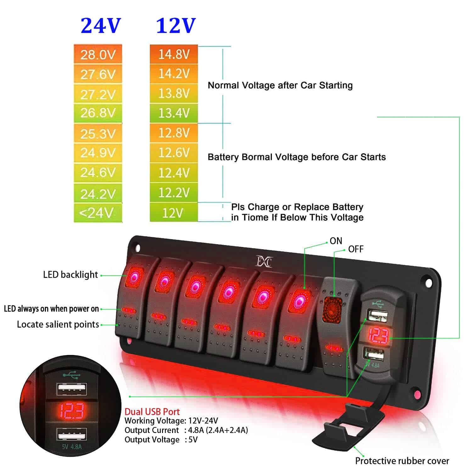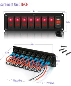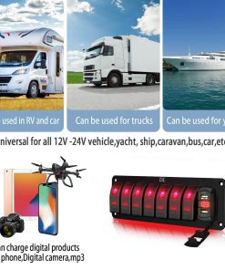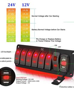 1. Panel de interruptores basculantes de 7 Gang con doble cargador USB y voltímetro digital, ideal para todo tipo de control de circuitos, necesidades de carga y monitoreo de voltaje. 2. Cargador USB súper rápido de 4.8A Cargador USB doble súper rápido de 4.8A, 2.4A en cada puerto USB. Funciona para todos los dispositivos alimentados por USB, haciendo que el cargador sea un 30% más rápido que los cargadores convencionales. 3. Visualización de voltaje LED El voltímetro está integrado en el centro del cargador USB, muestra claramente las lecturas actuales de los voltios de trabajo, previniendo problemas causados por voltaje bajo. 4. Garantía de Calidad: Certificado CE & ROHS, Fabricado con panel de aluminio reforzado y ABS premium. Construido con fusibles que protegen el panel de sobrecalentamiento, sobrecorriente, sobre carga y cortocircuito. Interruptor de 5 pines estándar, clasificado a DC 12V/20A y DC 24V/10A. 5. Amplia Aplicación: Perfecto para controlar Barra de Luces LED, Luces Laterales, Luces Traseras, Luces de Techo, Luces de Roca, Luces de Cola y Lámparas Auxiliares, etc. 6. Vehículos Aplicables: Ampliamente utilizado para Jeep, Carrito de Golf, Coche, Wrangler, Silverado, Tundra, Tacoma, Offroad, Motonieve, Autocaravana, Remolque, Camión, Autobús, Camión, Caravana, Motos, F350, RV, UTV, ATV, SUV, RZR, Van, 4Runner, 4X4, etc. 7. Servicios de Postventa de Por Vida Si hay alguna pregunta al instalar o usar el producto, no dude en contactarnos. ¡Suministraremos servicios de postventa de por vida y haremos todo lo posible para resolver el problema para usted!