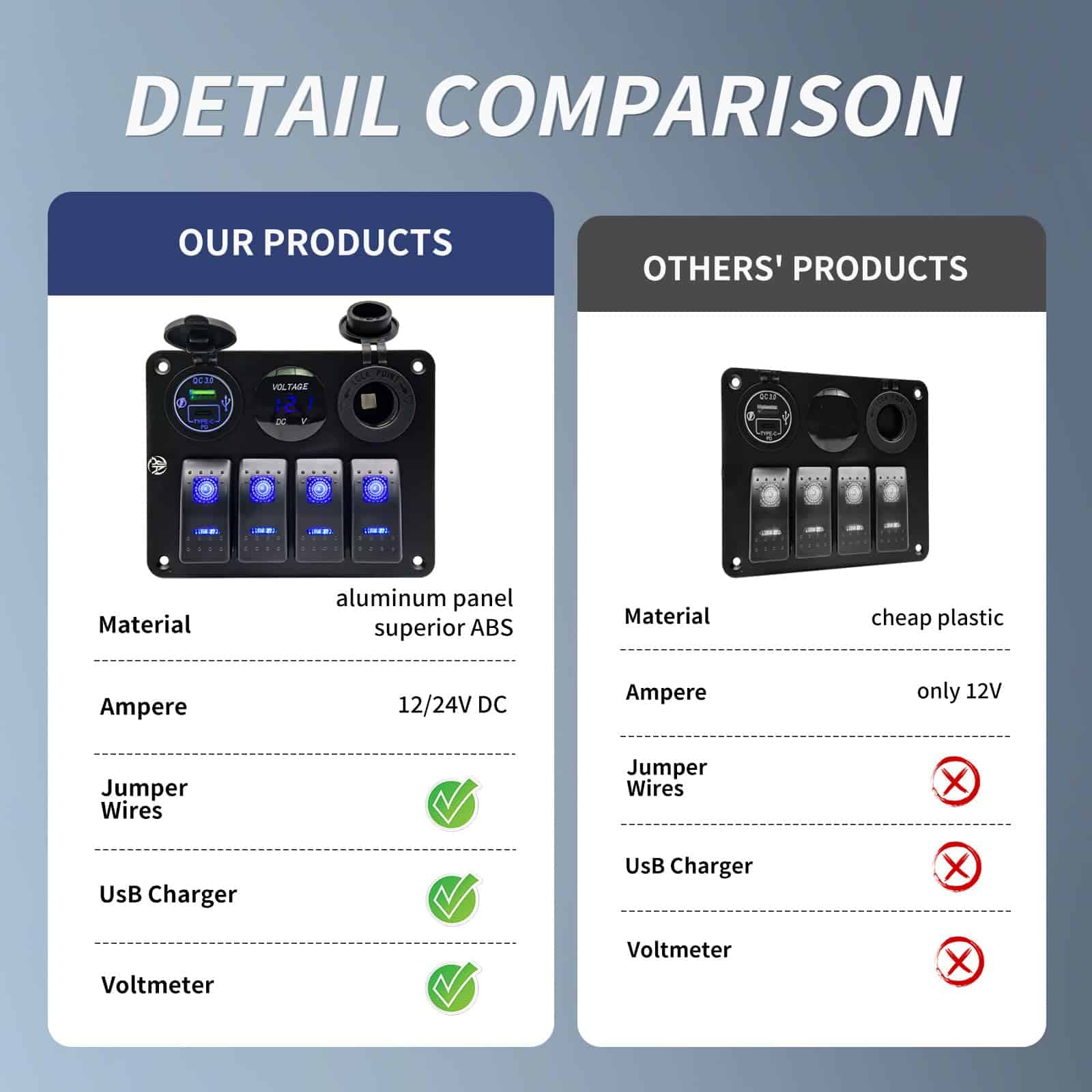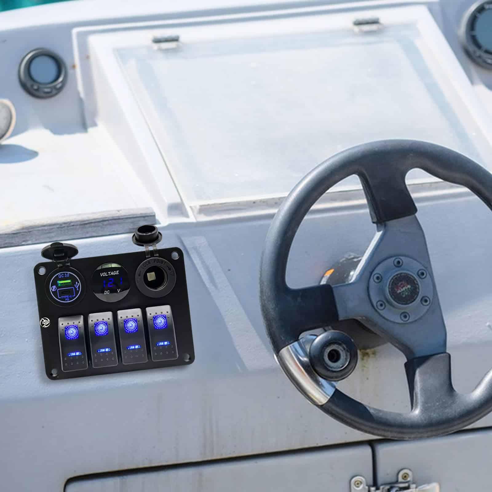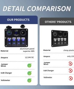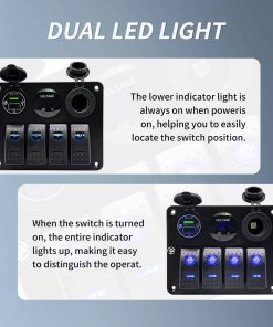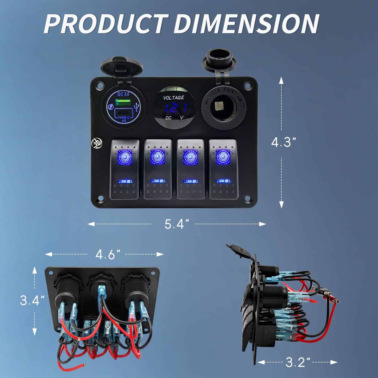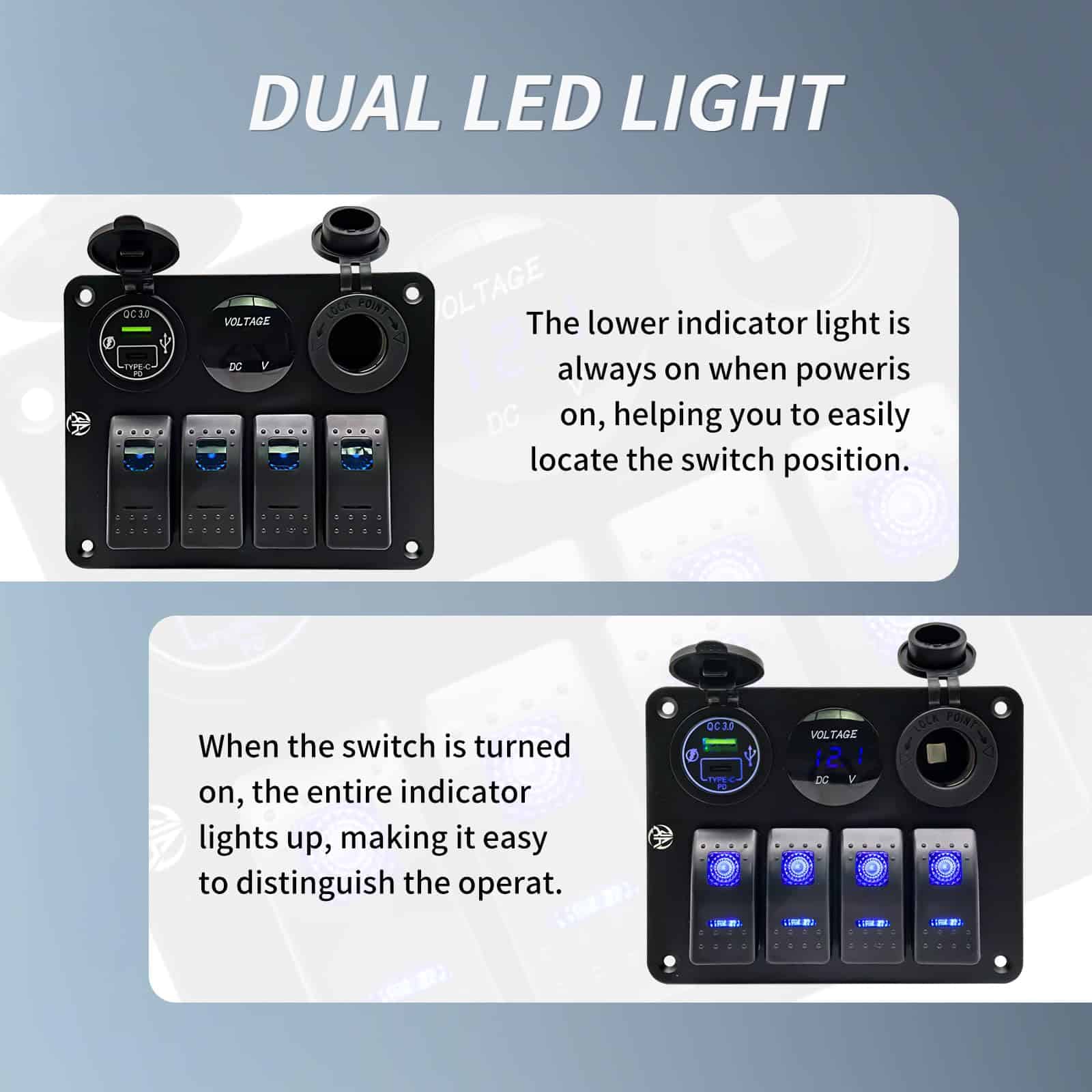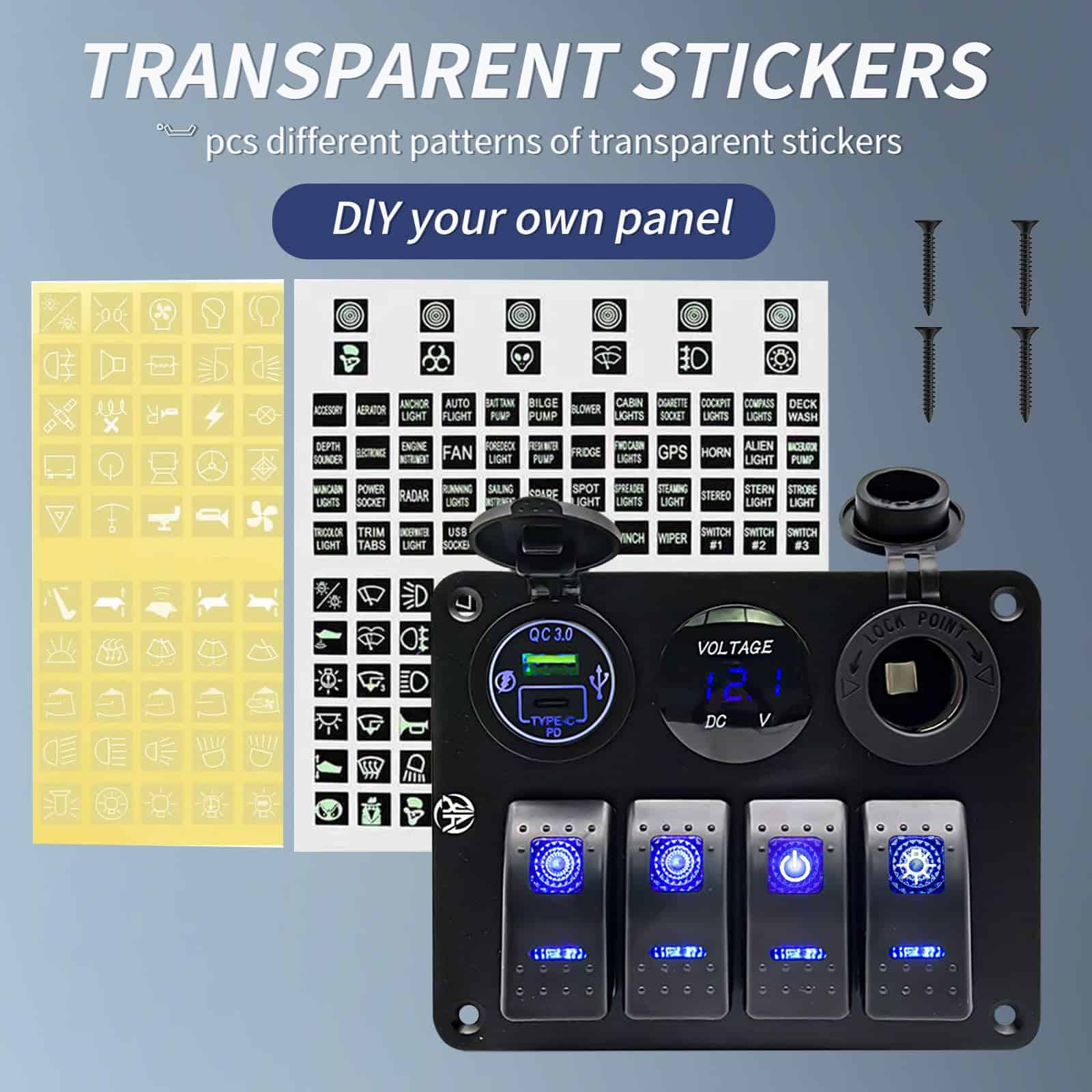 1. El paquete incluye 4 interruptores basculantes, un enchufe para cigarrillos, un cargador USB PD Tipo C y un voltímetro LED, ideal para todo tipo de control de circuito, necesidades de carga y monitoreo de voltaje.