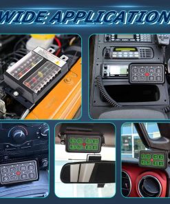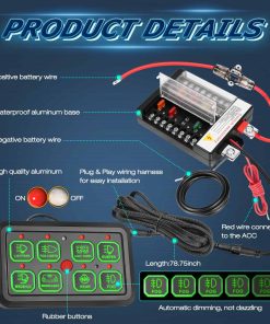 1. PANEL DE INTERRUPTORES DE 8 VÍAS – Este avanzado panel de interruptores atenuable puede ayudarte a controlar 8 luces LED diferentes o accesorios eléctricos al mismo tiempo, brindándote comodidad y garantizando tu seguridad al conducir. El fondo verde se ajustará automáticamente según la luminosidad del entorno, evitando el deslumbramiento y protegiendo tu visión. Voltaje de funcionamiento: 12-24V; Potencia máxima: 1200W; Corriente máxima: 60A.
