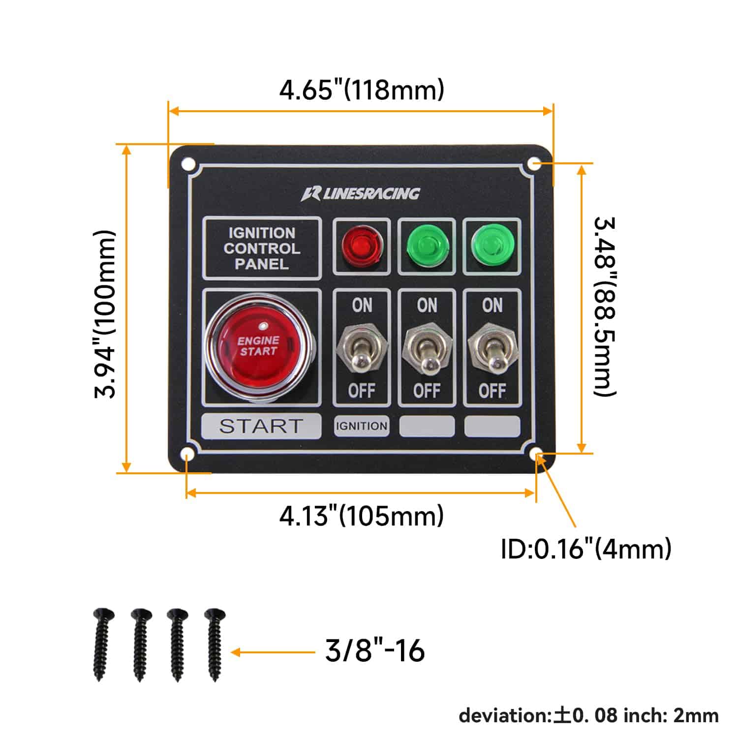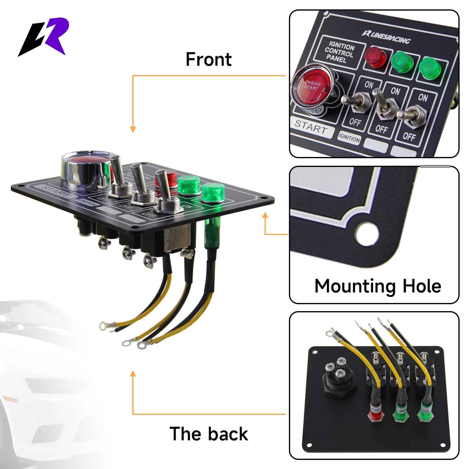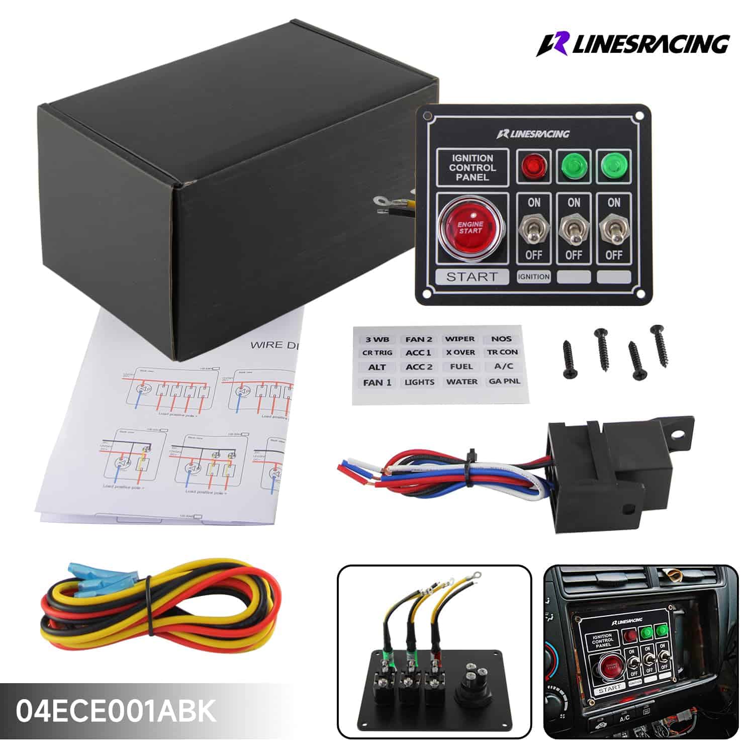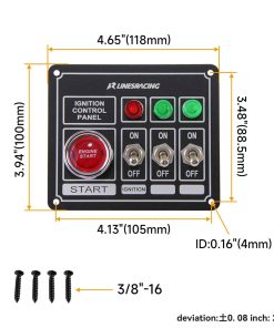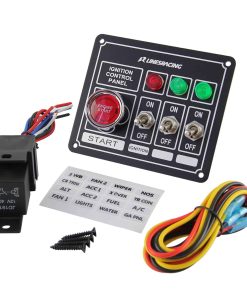 Panel de interruptores de carreras con botón de arranque de motor, 3 opciones de encendido/apagado, 3 luces indicadoras, relé incluido, incluye cableado. Incluye la misma imagen que se muestra.