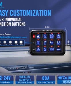 PANEL DE SWITCH MÁS GRANDE, MÁS SEGURO: El panel de interruptores de 12 vías actualizado es más grande que otros en el mercado. El panel de control aumenta el tamaño en un 20%, asegurando una corriente grande y mayor estabilidad. Clasificado en 960W/12V, 1920W/24V, Corriente máxima: 80A, Temperatura de funcionamiento: -40 C ~ +105 C, Índice de impermeabilidad IP65. Carcasa de aleación de aluminio con resistente soporte de hierro para un largo tiempo de servicio. Se incluyen 5 fusibles adicionales para proteger bien su circuito de automóvil.