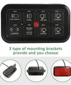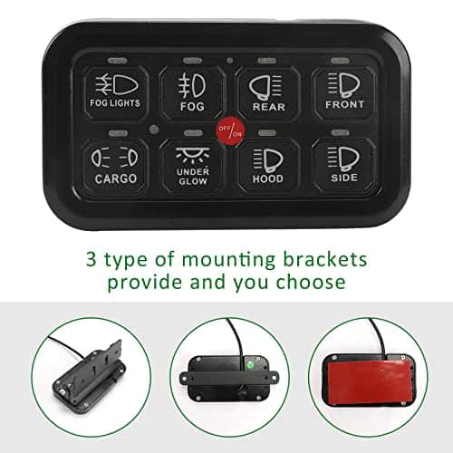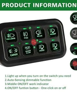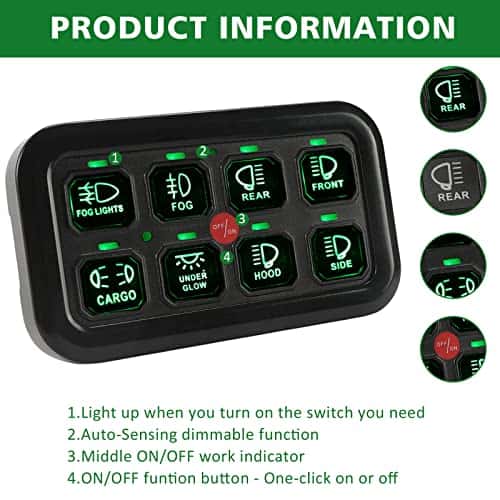 1. Compatible con todos los vehículos de 12V/24V DC como ATV, UTV, SUV, RZR, automóvil, motocicleta, camión, todoterreno, bote, Polaris, etc. El diseño profesional del interruptor de 8 vías está dedicado a ayudarlo a ahorrar tiempo y conducir de manera segura, facilita el control de los accesorios en el automóvil. 2. Panel de interruptores de 8 vías SUNPIE: Voltaje de funcionamiento: 12-24V, Potencia máxima: 1,200 W, Corriente máxima: 60A. Este potente panel de interruptores reemplaza otros diseños de relé voluminosos, con un tamaño reducido, y le permite controlar 8 juegos de luces LED y accesorios de manera más conveniente. La instalación fue fácil y sencilla. 3. Sensor de brillo automático: tiene un sensor en el Panel de interruptores de 8 vías actualizado que se atenúa automáticamente según la luz. En comparación con el panel de interruptores común, puede proteger la visión del conductor para una experiencia de conducción más cómoda. 4. Instalación fácil y diseño de seguridad: el panel de interruptores de 8 vías fue la solución perfecta sin adornos que limpió su compartimento del motor, organizó todos los cables. Con protección de polaridad inversa, protección de sobrecarga, protección térmica, interruptor de circuito de 60A independiente, para garantizar el funcionamiento seguro de luces LED y otros accesorios. Hay dos métodos de instalación. Viene con soportes de montaje o se utiliza cinta de doble cara para sostenerlo. 5. INCLUYE: 1 x caja de control de interruptores, 1 x panel de interruptores, 2 x soportes de montaje, 1 x correa, 1 x arnés de cables, 1 x interruptor de circuito, 2 x destornilladores Phillips (4x75mm y 6x125mm), 2 x pegatinas adhesivas (100x50x0.8mm y 150x80x0.8mm), 1 x llave (8x10mm), 1 x 60PCS calcomanías DIY y 1 x manual de usuario. Ofrecemos una garantía de 12 meses, cualquier problema o pregunta se resolverá y responderá en un plazo de 24 horas.