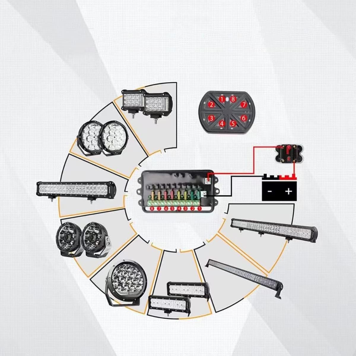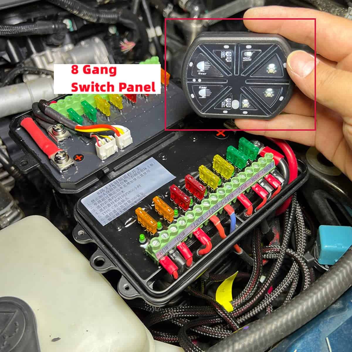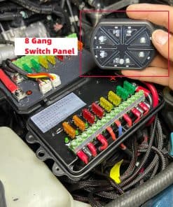 El Panel de Interruptores de 8 Grupos de 12V/24V puede ser controlado de forma remota con un alcance de 0.13 millas e incluye imanes en la parte trasera para fijarse a cualquier superficie ferrosa. Esto significa que no tienes que salir del coche cada vez que haces una prueba, después de instalar el LED, solo tienes que presionar el control remoto para ver el efecto. Este producto es ampliamente recomendado para modelos como Tacoma, F150, F250, F350, Ranger, 4Runner, Tundra, RAV4, Silverado, GMC, CRV, YUKON, RAM1500, Suburban, Bronco. Su aplicación incluye luces delanteras, luces antiniebla, luces de advertencia, interruptores de refrigerador de coche, puntos de recogida de equipos externos de coche, encendedores de cigarrillos, etc. Cuenta con 128 etiquetas personalizadas para ayudarte a definir cada botón según tus necesidades. Además, garantiza seguridad con protección contra sobrecorriente, protección de polaridad inversa y protección térmica, lo que te permite usarlo de forma segura y confiable. El control remoto cuenta con carga TYPE-C, que es conveniente y duradera.