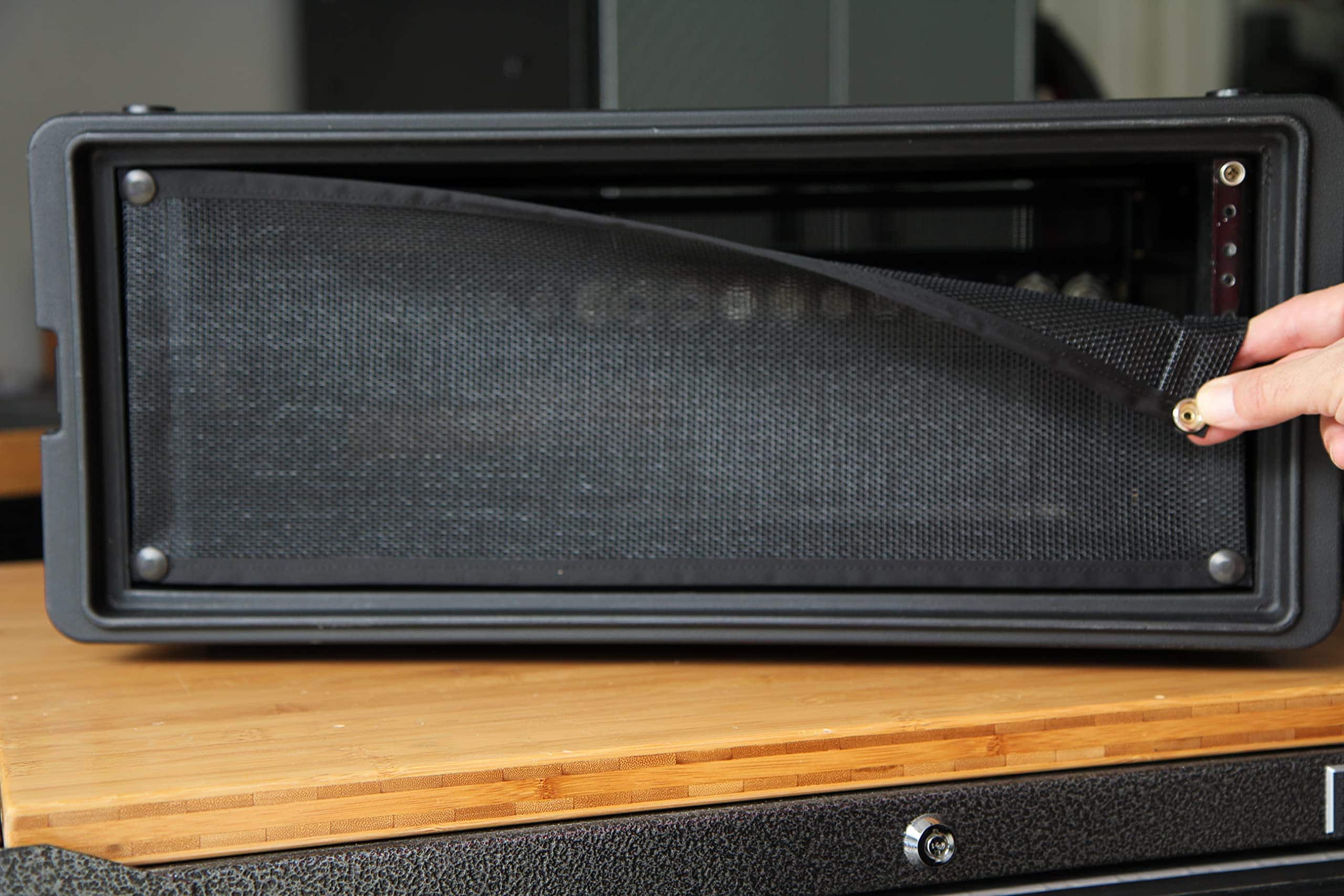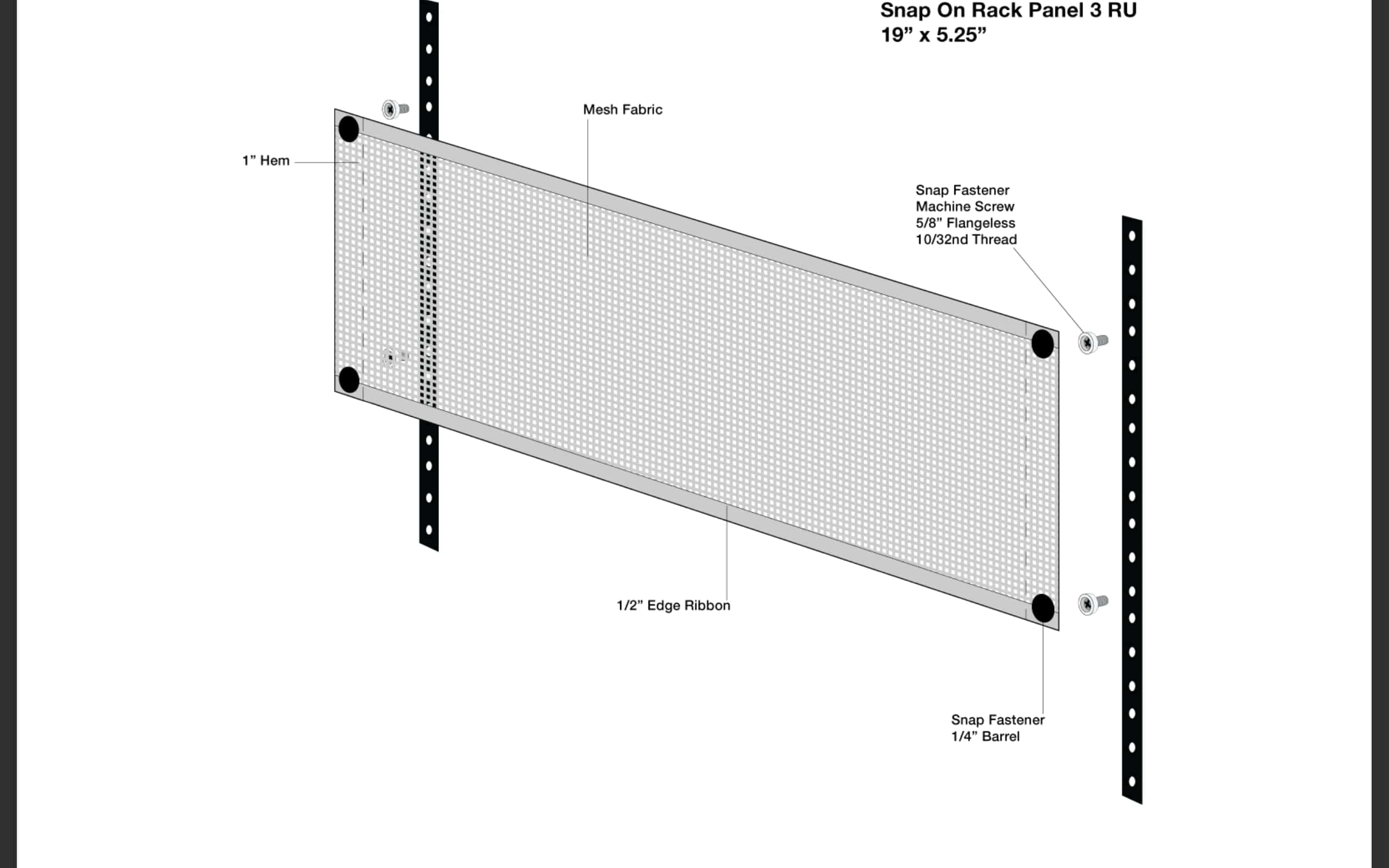 Los paneles Snap-On Rack son una nueva línea de paneles de tela fabricados con tela de cordura resistente o malla para ventilación. Este panel en blanco de 3U tiene tela de malla perforada para mantener un flujo de aire adecuado y se ajustará a cualquier rack estándar de 19″.