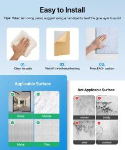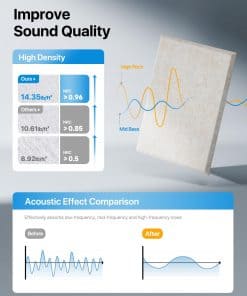 La fácil instalación de los paneles autoadhesivos los hace ideales para una variedad de espacios, como hogares, oficinas, estudios de grabación, transmisiones en vivo y salas de conferencias. Su diseño de borde biselado de 45 y su cobertura de 16 pies cuadrados garantizan una instalación sin costuras y estéticamente agradable. Además, las instrucciones de desmontaje facilitan la remoción de los paneles sin dañar la pared. Mejora tu ambiente acústico y disfruta de una calidad de sonido y confort mejorados con estos versátiles paneles acústicos.