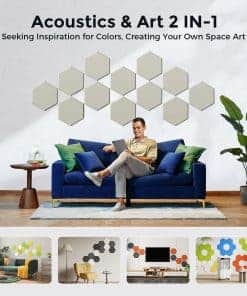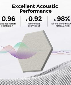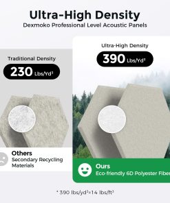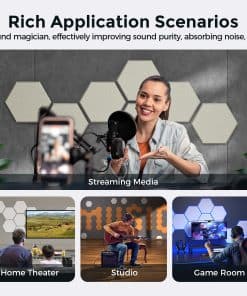 La segunda generación de paneles de espuma insonorizante utiliza nuestra exclusiva tecnología patentada de AGUJA DE PUNZADO AL VACÍO, que hace que los paneles sean más densos y duraderos que la generación anterior. Nuestros paneles acústicos tienen una alta densidad de 390 lbs/yd , un 30% más alta que productos similares. Esto significa que nuestros paneles tienen una mejor absorción de sonido y rendimiento de aislamiento, así como una textura más suave. La instalación es fácil, ya que los paneles acústicos hexagonales tienen un fuerte adhesivo autoadhesivo que se adhiere a cualquier superficie limpia y plana. Puedes instalar los paneles de pared acústicos en solo 10 minutos y crear diseños creativos con nuestra herramienta de separación de instalación gratuita incluida en cada paquete. Nuestro adhesivo para paneles pasó la prueba de tensión final de 88,2 onzas. Esto significa que los paneles de pared insonorizados pueden lograr una estabilidad de instalación a largo plazo y confiable. El producto es seguro y hermoso, ya que los paneles de amortiguación de sonido han pasado la CERTIFICACIÓN SGS. Utilizamos solo materiales de poliéster 6D de alta calidad, no residuos reciclados, para hacer el producto a prueba de sonido seguro y respetuoso con el medio ambiente. Nuestros paneles de pared hexagonales no tienen olor, toxinas ni formaldehído, por lo que son adecuados para niños y mascotas. Los azulejos acústicos tienen una gran consistencia de color, estabilidad y atractivo estético, mejorando el aspecto y la sensación de tu espacio. Nuestros materiales de tratamiento acústico de alta calidad son adecuados para diversos entornos, como estudios, salas de música, salas de conciertos, estudios caseros, salas de juegos, salas de cine en casa, dormitorios, etc. También se pueden instalar en paredes y puertas para reducir la transmisión de sonido. Elige nuestros paneles acústicos y disfruta de una experiencia acústica profesional mañana.