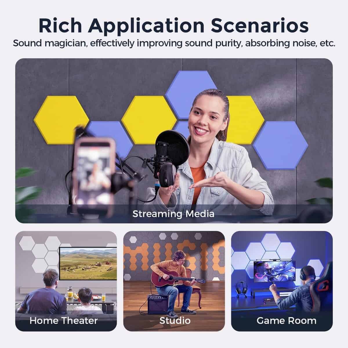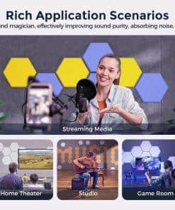 5. Escenarios de Aplicación Versátiles: Nuestros materiales de tratamiento acústico de alta calidad son adecuados para varios entornos, como estudios, salas de música, salas de conciertos, estudios caseros, salas de juegos, cines en casa, dormitorios, etc. También se pueden instalar en paredes y puertas para reducir la transmisión del sonido. Elige nuestros paneles acústicos y disfruta de una experiencia acústica profesional mañana.
