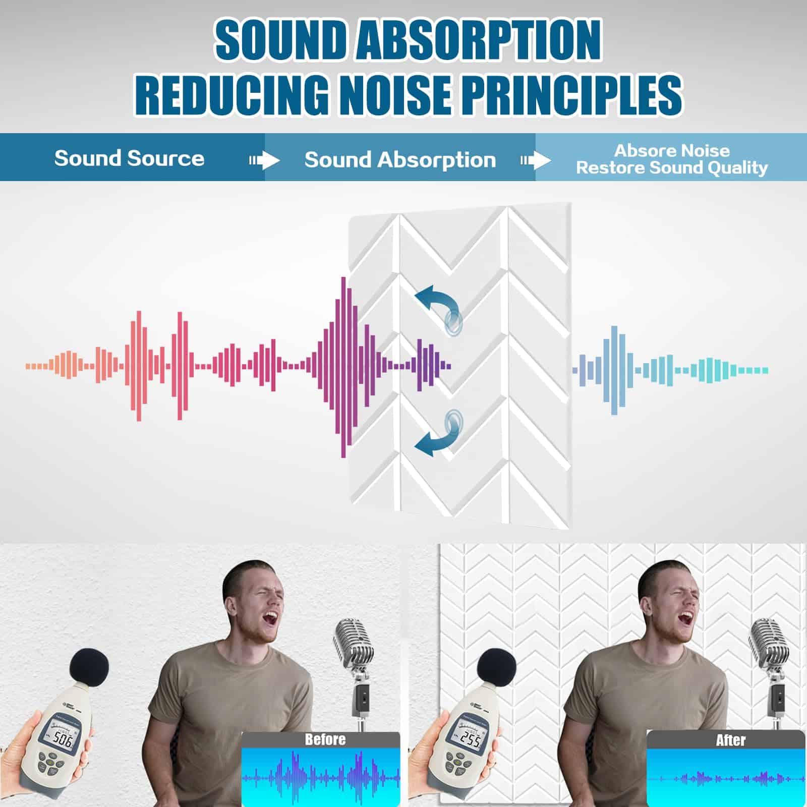 3. MATERIALES ECOLÓGICOS Y DE ALTA CALIDAD: Nuestros innovadores paneles de pared de absorción de sonido están hechos de fibra de poliéster 100%, que es segura, inofensiva e inodora, con un coeficiente de reducción de ruido de 0.92. La densidad de 9.7 lb/pie significa que nuestro panel de sonido puede rendir mejor en términos de absorción de sonido, reducción de ruido, cancelación de eco y reverberación.