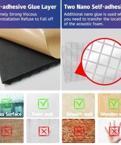 3. Autoadhesivo Conveniente: Nuestros paneles de espuma vienen con una capa autoadhesiva, despegue el papel kraft en la parte trasera y péguelo a voluntad. También incluimos dos láminas de autoadhesivo nano adicionales de repuesto cuando necesite cambiar la ubicación de la espuma acústica.