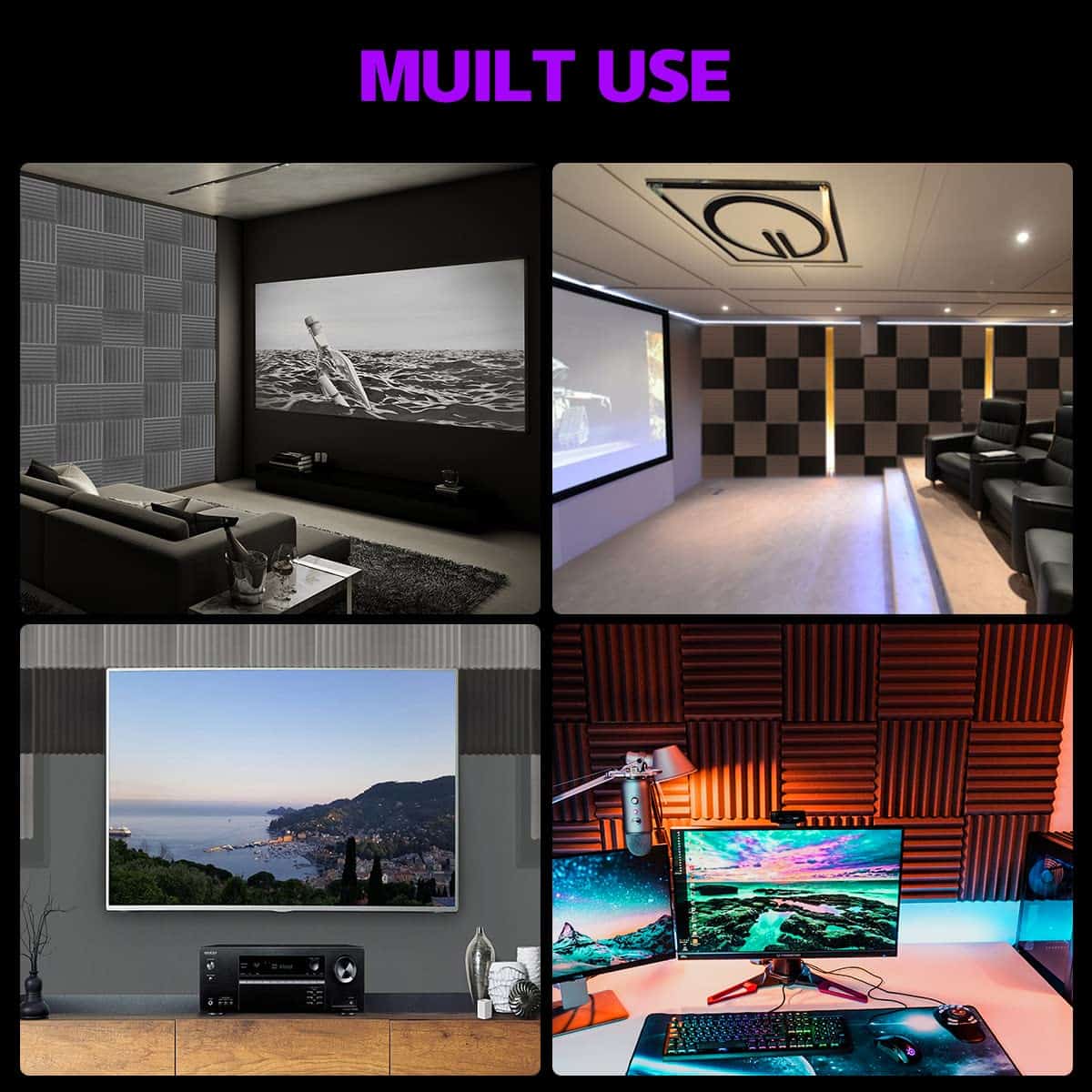 5. Uso Amplio: Los paneles de pared acústicos se pueden instalar en una variedad de superficies diferentes (paredes, puertas, ventanas, techos, etc.), adecuados para estudios de grabación, oficinas, teatros en casa, salas de juegos y más. Los paneles acústicos se pueden cortar fácilmente al tamaño que desee sin comprometer el rendimiento de la espuma acústica.