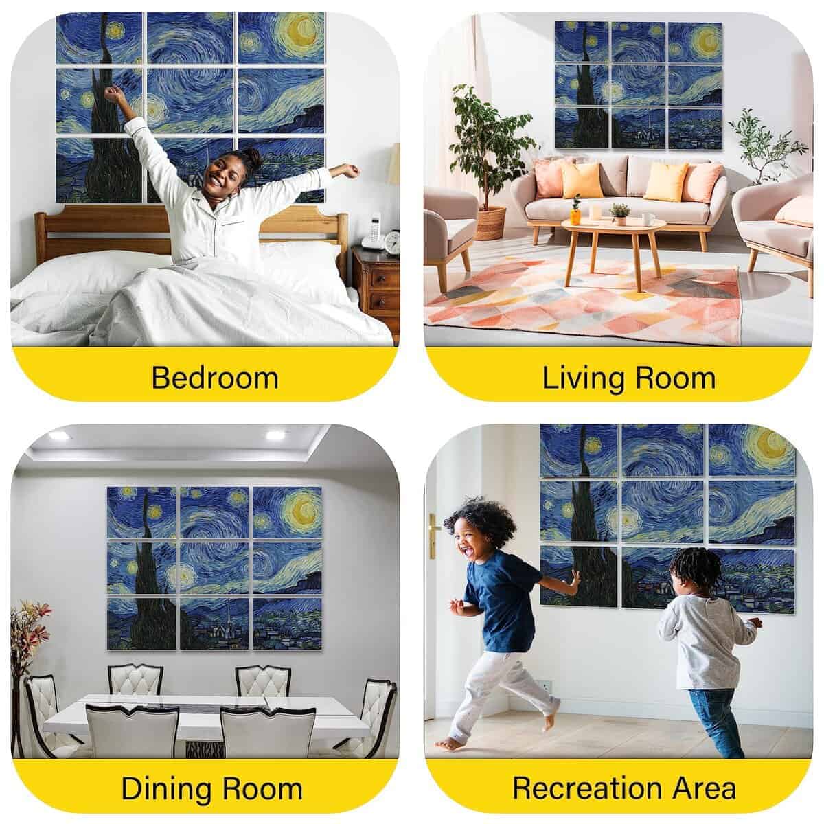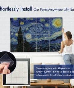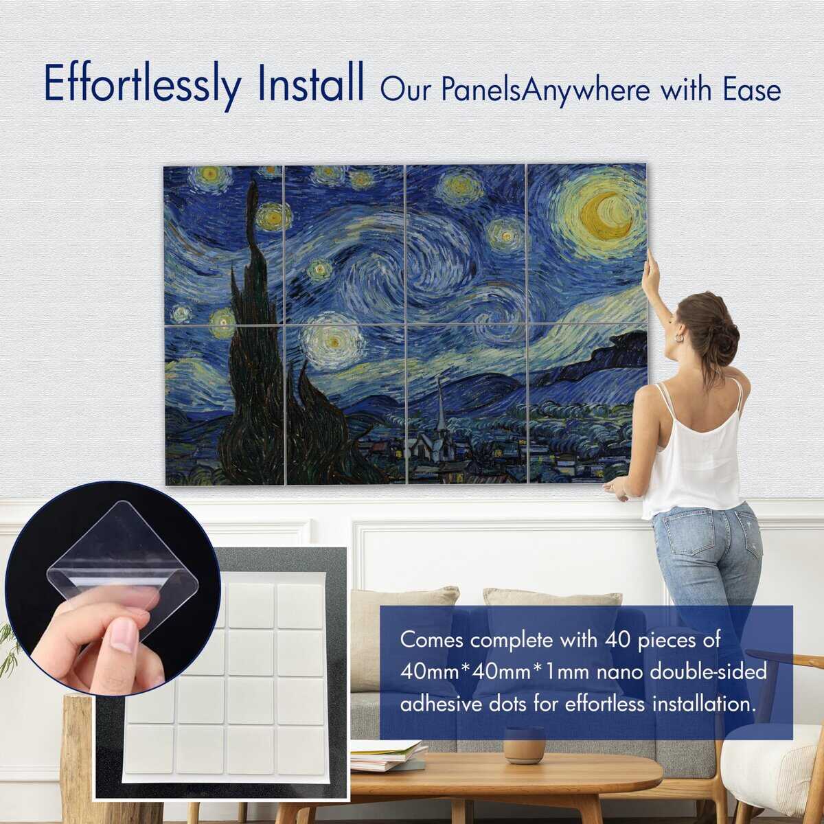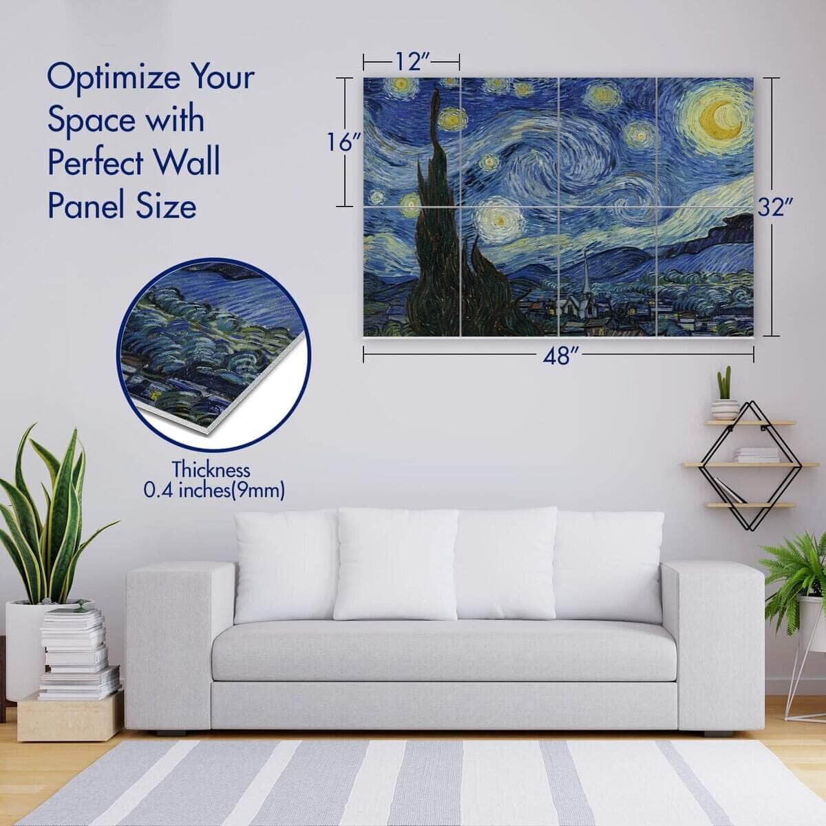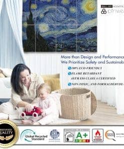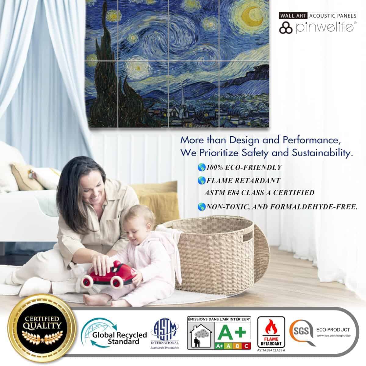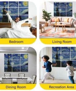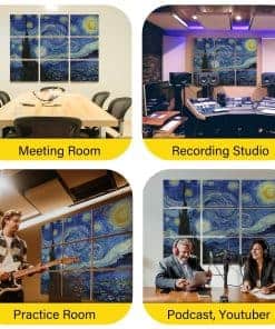 1. Material de Calidad: Nuestros paneles acústicos están fabricados con materiales de poliéster de alta calidad, asegurando durabilidad y longevidad. A diferencia de alternativas más baratas, nuestros paneles utilizan hilos de poliéster nativos altamente retardantes de llama, ofreciendo una eficacia superior en retardante de llama. 2. Absorción de Sonido: Diseñados para una absorción de sonido excepcional, nuestros paneles mejoran la calidad acústica de cualquier espacio con un NRC máximo de 0.95. La información detallada de las pruebas se proporciona en la documentación adjunta. 3. Densidad: Con una densidad de 2.3 kg/m , nuestros paneles ofrecen una reducción de ruido efectiva manteniendo un atractivo estético. 4. Estándares de Seguridad: Nuestros productos cumplen con estándares internacionales de resistencia al fuego, alcanzando la calificación más alta de Clase A (ASTM E84 de EE.UU.), garantizando una seguridad inquebrantable. 5. Responsabilidad Ambiental: Nuestros paneles son libres de VOC y cuentan con certificaciones no tóxicas (Clase A+ para emisiones en el aire interior), haciéndolos respetuosos con el medio ambiente y adecuados para diversos entornos. Todas las certificaciones son accesibles a través de la documentación proporcionada. 6. Toque artístico: Presentando impresiones de alta resolución de obras maestras de artistas renombrados como Van Gogh, Claude Monet, Paul Gauguin y Katsushika Hokusai, nuestros paneles utilizan Impresión por Sublimación de alto costo para patrones vibrantes y resistentes a la decoloración. 7. Versatilidad: Ideal para estudios de grabación, salas de cine en casa, oficinas y cualquier espacio donde la calidad del sonido sea primordial, nuestros paneles mejoran la funcionalidad sin comprometer el atractivo estético. 8. Instalación Sencilla: Cada compra incluye 40 piezas de adhesivo nano putty (40mmx40mmx1mm), facilitando una instalación fácil sin necesidad de herramientas adicionales o asistencia profesional. 9. Atractivo Estético: Con obras de arte de pintores celebrados, nuestros paneles infunden a las habitaciones con sofisticación artística, fusionando perfectamente el estilo con la funcionalidad. 10. Soporte al Cliente: Nos enorgullecemos de ofrecer un servicio al cliente excepcional, disponible para abordar cualquier consulta o preocupación con respecto a nuestro producto.