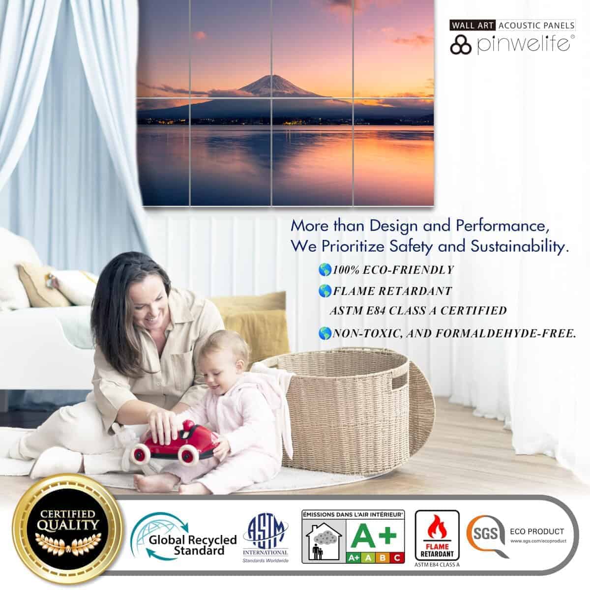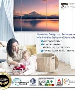 3. «Ecológico y Seguro para Todos» – Hecho de 100% poliéster de alta densidad (2.3 KGm) con hilos de poliéster nativos de alta resistencia al fuego, NO el proceso usual más barato de remojo con aditivos (pobre eficacia ignífuga, nuestros paneles son reciclables y han pasado las certificaciones ignífugas (Clase A, ASTM E84 de EE. UU.) y no tóxicas (Emisiones en aire interior, Clase A+). Utilizando la costosa impresión por sublimación para garantizar patrones vibrantes resistentes a la decoloración, haciéndolo más duradero y seguro para todos.