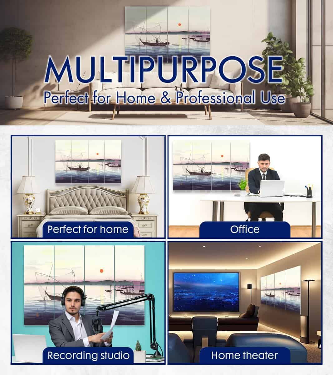 «Diseño elegante y funcionalidad» – Nuestros paneles acústicos de arte no solo son hermosos, sino también seguros y ligeros. El diseño elegante agrega un toque de sofisticación a cualquier espacio, lo que lo hace perfecto para el hogar, la oficina, el estudio de grabación, KTV o el cine en casa. NRC: 0.95. «Eco-Friendly y seguro para todos» – Hecho de poliéster 100% de alta densidad (2.3 KGm) con hilos de poliéster nativos de alto poder retardante de llama, NO el proceso más barato habitualmente impregnado de aditivos (pobre poder retardante de llama, nuestros paneles son reciclables y han pasado las certificaciones retardantes de llama (Clase A, ASTM E84 de EE. UU.) y no tóxicas (Emisiones en aire interior, Clase A+). Utilizando la impresión por sublimación de alto costo para garantizar patrones vibrantes y resistentes a la decoloración, haciéndolos más duraderos y seguros para todos. «Instalación fácil para su comodidad» – Nuestro producto viene con partículas de nanoadhesivo de doble cara para una instalación fácil. Tenga en cuenta que no es adecuado para paredes rugosas o irregulares. «Satisfacción garantizada» – Ofrecemos un servicio al cliente profesional las 24 horas y una política de devolución que garantiza su satisfacción. Si no está contento con nuestro producto, nuestros ingenieros acústicos analizarán su situación específica y trabajarán con usted para encontrar una solución. Si no podemos resolver el problema, le reembolsaremos el 100%.