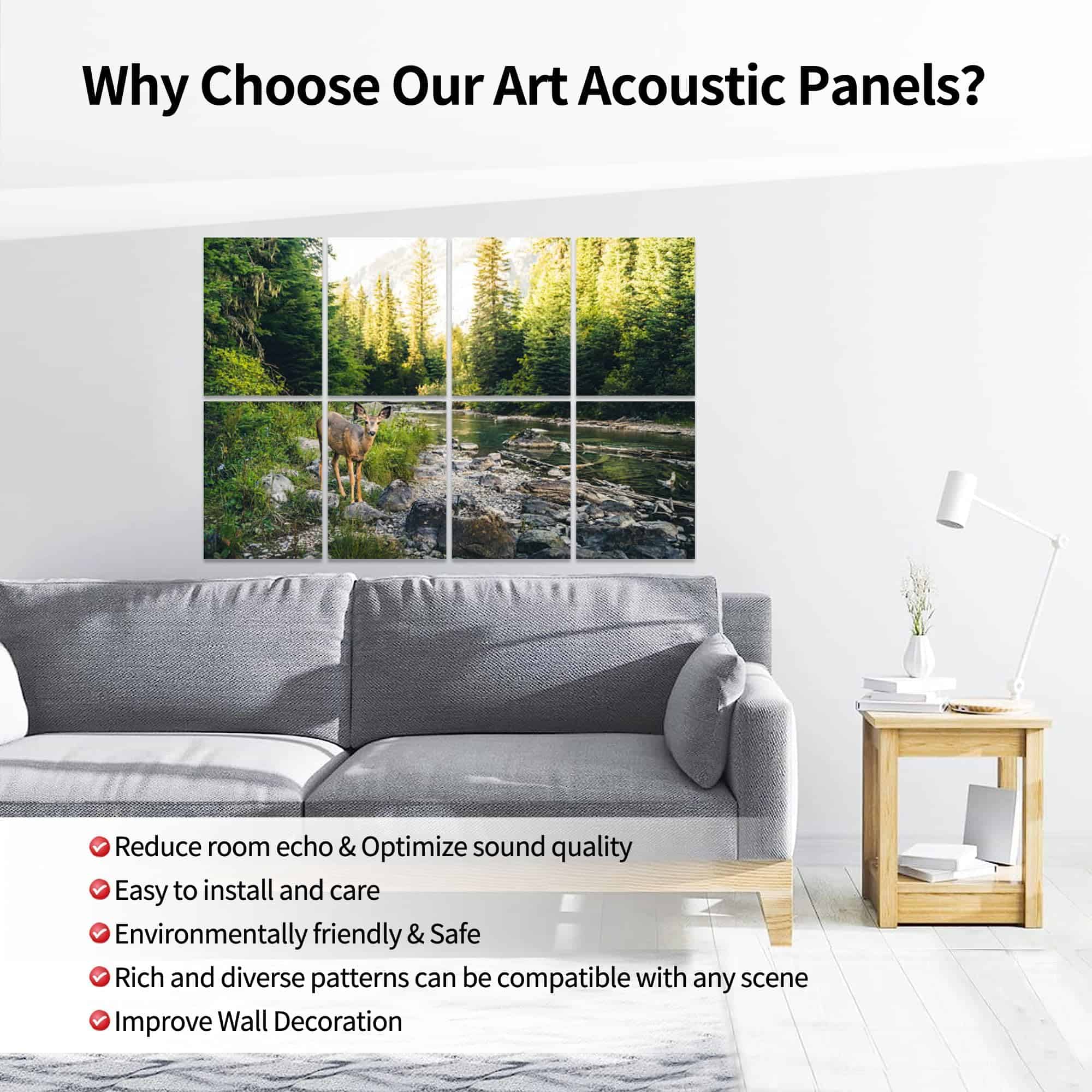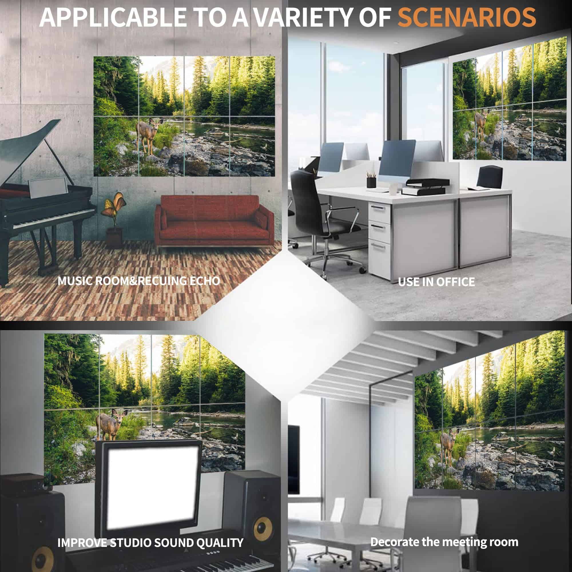 1. Decoración de Pared de Moda: La moderna pintura de arte de pared decorativa es una combinación de tratamiento acústico y funciones de arte decorativo moderno, que pueden traer buenos efectos visuales y es adecuada para salas de estar, estudios, salas de reuniones, salas de conciertos, KTV y otros teatros en casa. 2. Diseño Moderno Único: Deje que los paneles de pared decorativos con estilo de diseño moderno y colores elegantes sean el arte decorativo de su espacio. Nuestros tableros artísticos absorbentes de sonido son más seguros, más ligeros y más brillantes en color. 3. Fácil de Instalar y Cuidar: Nuestros paneles artísticos absorbentes de sonido están diseñados con autoadhesivo, solo despegue y pegue, se pueden pegar fácilmente en diversas superficies lisas, la instalación es fácil y completa. 4. Tratamiento Acústico de Alta Calidad: Los paneles de pared insonorizados de alta calidad tienen excelentes efectos de absorción de sonido, que pueden reducir eficazmente la reverberación y el eco en interiores, reducir varios ruidos espaciales y mejorar la calidad del sonido, para que pueda tener una experiencia tranquila y cómoda. 5. Material de Alta Calidad: El panel de pared insonorizado artístico está hecho de fibra de poliéster, que es un excelente material para absorber ruido sin ningún olor. Tiene una amplia gama de usos, es seguro y respetuoso con el medio ambiente, y es superior en todos los aspectos a la espuma absorbente de sonido.