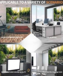 ¡Una Nueva Forma de Decorar su Espacio! Panel acústico decorativo Procesamiento acústico profesional para crear un hermoso entorno de grabación. Los paneles de pared insonorizados de alta calidad combinan buenos efectos de absorción de sonido con la presentación de arte de pintura, brindando un cómodo efecto visual y mejorando el efecto de aislamiento acústico de la habitación. Los paneles decorativos absorbentes de sonido se pueden utilizar como paredes y techos en diversos lugares, como teatros, cines, estudios de grabación, gimnasios, subterráneos, estaciones, oficinas, escuelas, etc. Pueden reducir eficazmente el eco y el ruido interior y mejorar la calidad del sonido. Al mismo tiempo, también se utiliza para la decoración, haciendo que su habitación sea más hermosa y práctica. Ventaja: – Absorción de Sonido Hecho de poliéster, es especialmente adecuado para reducir el ruido y el eco, ¡mejorando su entorno acústico! -Instalación Autoadhesiva: Gracias al fuerte respaldo adhesivo que se pega fácilmente en una variedad de superficies lisas sin dañar la pared. -Decoración Proporciona una variedad de estilos y patrones para elegir, diseño moderno, de moda y hermoso. -A Prueba de Fuego Se añade una fórmula ignífuga al tablero aislante acústico para mantenernos alejados del peligro de incendio. -Respetuoso con el Medio Ambiente Material de fibra de poliéster virgen de alta calidad, inodoro y libre de contaminación, saludable y respetuoso con el medio ambiente. Especificaciones: Tamaño: 48» 32» 0.4» Cantidad: 8 piezas Material: Fibra de Poliéster Fácil de Instalar: Cinta adhesiva de doble cara incluida