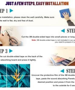 ¿POR QUÉ ELEGIR RUONIN.X? Nuestros Paneles Acústicos de Arte tienen las siguientes propiedades que no puede rechazar: Absorción de sonido superior Variedad de opciones decorativas Aislamiento térmico confortable Seguridad contra incendios Salud y protección ambiental Ligero y fácil de instalar Estable y no se decolora Resistencia al impacto Información de especificación Tamaño: 72 X 48 X 0.4 pulgadas Fibra de poliéster 100 por ciento Densidad alta de 229kg/m3 El principal alcance de aplicación: salas de pruebas de equipos audiovisuales, estudios de grabación, salas de música, salas de cine en casa, teatros, oficinas, salas de conferencias, salas de conciertos, aulas, KTV, hoteles, decoración del hogar en la sala de estar y otros lugares que requieren un alto tratamiento acústico. Método de instalación y pasos: Antes de la instalación, limpie cuidadosamente la pared. Asegúrese de que la pared esté plana, seca y libre de polvo. Confirme la dirección y posición de cada panel para garantizar la correcta combinación de patrones. Corte la cinta adhesiva de doble cara 3M a una longitud de aproximadamente 20-22 pulgadas.