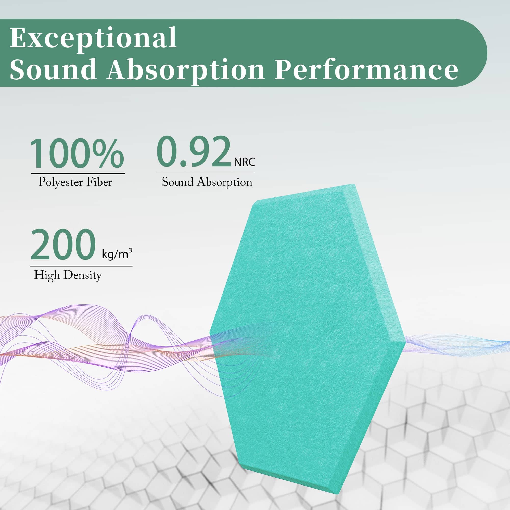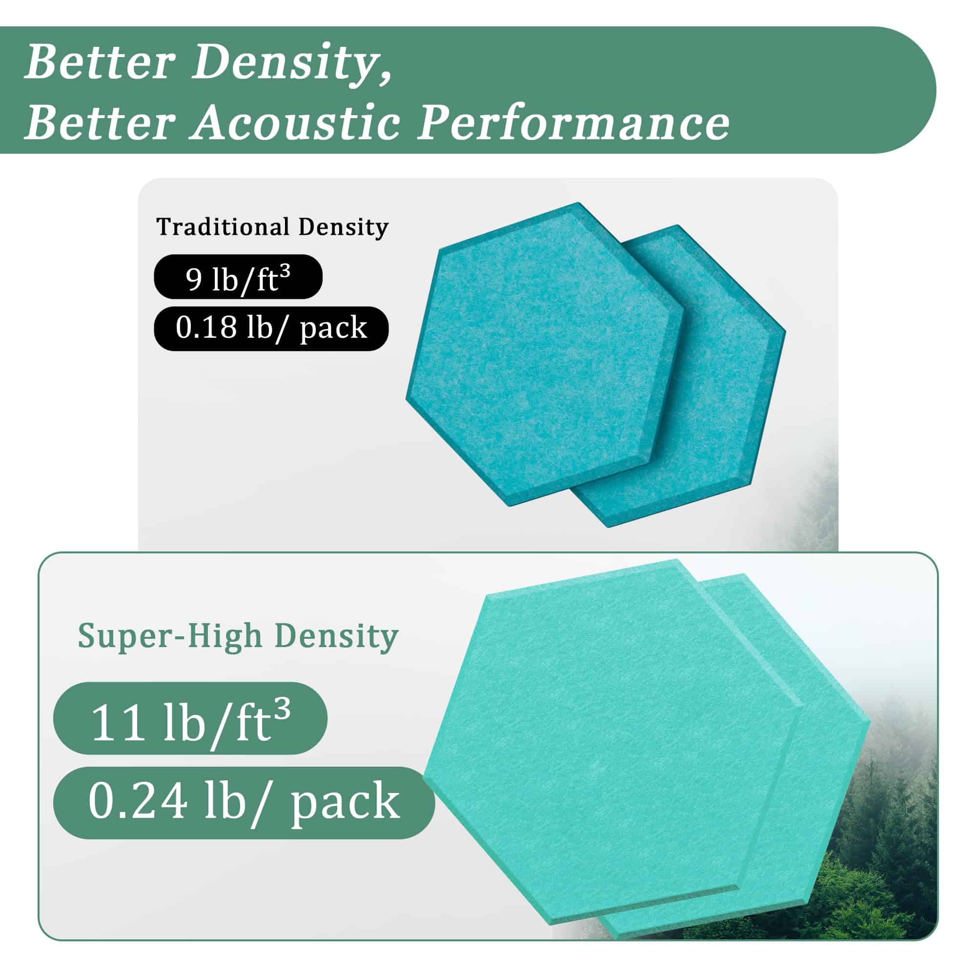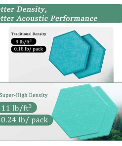 1. Absorción de Sonido Excepcional Nuestros paneles absorbentes de sonido tienen una densidad de hasta 420 lb/m . Su estructura única y alta densidad pueden reducir significativamente el eco y los ecos en un espacio. Cada panel pesa 0.24 lbs, lo que ayuda a reducir el ruido en cierta medida.