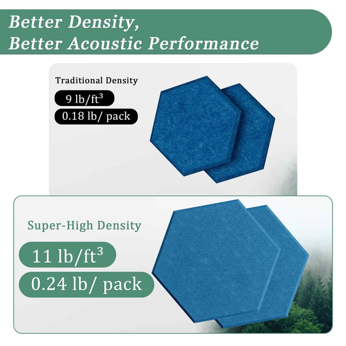 1. Absorción de Sonido Excepcional Nuestros paneles absorbentes de sonido tienen una densidad de hasta 420 lb/m . Su estructura única y alta densidad pueden reducir significativamente el eco y los reverberaciones en un espacio. Cada panel pesa 0.24 lbs, lo que ayuda a reducir el ruido en cierta medida.