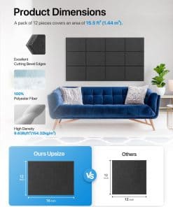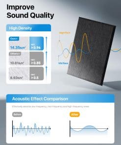 Soundproofing panels have a noise reduction coefficient (NRC) of up to 0.9; made of high-density material (230 kg/m ); effectively eliminate echoes and background noise. Paneles acústicos cubren 16 pies cuadrados; los paneles de pared acústicos cuentan con un diseño de borde biselado de 45 °; instalación sin costuras sin espacios para una apariencia estéticamente agradable. Paneles autoadhesivos: los paneles de pared insonorizantes vienen con respaldo adhesivo; retire la capa protectora y aplique directamente a cualquier superficie de pared para una instalación fácil. Material de alta calidad: los paneles de espuma insonorizante para paredes están hechos de fibra de poliéster 100% de alta calidad; duraderos y resistentes al desgaste; garantizan un rendimiento duradero. Instalación fácil: los paneles de pared insonorizantes autoadhesivos no requieren herramientas adicionales; se aplican fácilmente a paredes, puertas y techos para una configuración rápida y sin complicaciones. Amplia aplicación: los paneles acústicos son adecuados para diversos espacios, incluidos hogares, oficinas, estudios de grabación, transmisiones en vivo y salas de conferencias; mejoran el entorno acústico y mejoran la calidad del sonido y la comodidad. Instrucciones de desmontaje: si es necesario quitarlos, caliente los paneles de pared insonorizantes con un secador de pelo antes de pelarlos; esto ayuda a prevenir daños en la pared.