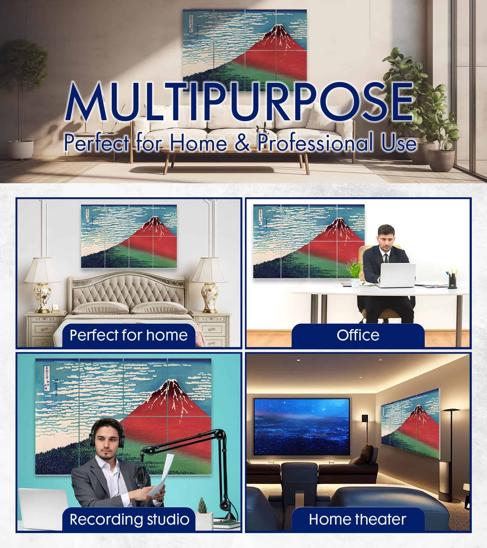 «Experimenta un sonido cristalino» – Los paneles acústicos Pinwelife están rigurosamente probados y certificados para una absorción máxima de sonido, reduciendo ecos y reverberaciones para mejorar la calidad del sonido y la claridad del habla. Perfecto para espacios con altos requisitos acústicos. «Diseño elegante que satisface la funcionalidad» – Nuestros paneles acústicos artísticos no solo son hermosos, sino también seguros y ligeros. El diseño elegante agrega un toque de sofisticación a cualquier espacio, haciéndolo perfecto para hogar, oficina, estudio de grabación, karaoke o cine en casa. NRC: 0.95. «Eco-Friendly y seguro para todos» – Hechos de 100% poliéster de alta densidad (2.3 KGm) con hilos de poliéster nativos de alta resistencia al fuego, NO el proceso más barato empapado en aditivos (efectividad de retardante de fuego pobre), nuestros paneles son reciclables y han pasado certificaciones de retardante de fuego (Clase A, ASTM E84 de EE. UU.) y no tóxicas (Emisiones en el aire interior, Clase A+). Utilizando la impresión por sublimación de alto costo para garantizar patrones vibrantes y resistentes a la decoloración, haciéndolos más duraderos y seguros para todos. «Instalación fácil para tu comodidad» – Nuestro producto viene con partículas de nano adhesivo de doble cara para una fácil instalación. Ten en cuenta que no es adecuado para paredes rugosas o desiguales. «Satisfacción garantizada» – Ofrecemos un servicio al cliente profesional las 24 horas y una política de devolución que garantiza tu satisfacción. Si no estás contento con nuestro producto, nuestros ingenieros acústicos analizarán tu situación específica y trabajarán contigo para encontrar una solución. Si no podemos resolver el problema, te reembolsaremos el 100%.