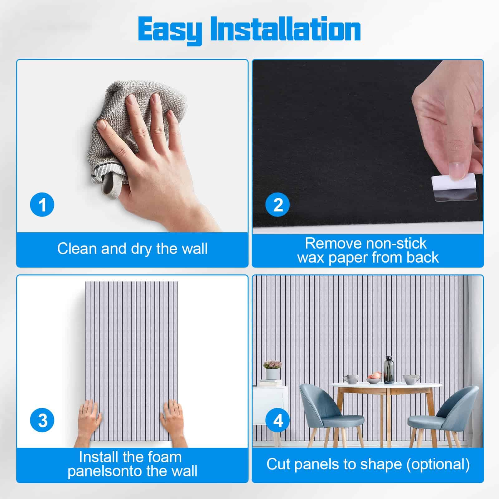 2. INSTALACIÓN SENCILLA: Estos paneles de pared insonorizantes vienen con un respaldo autoadhesivo, eliminando la necesidad de herramientas adicionales. Simplemente despegue y pegue los paneles de absorción de sonido en paredes, puertas o techos para una reducción rápida y efectiva del ruido en sus espacios favoritos.