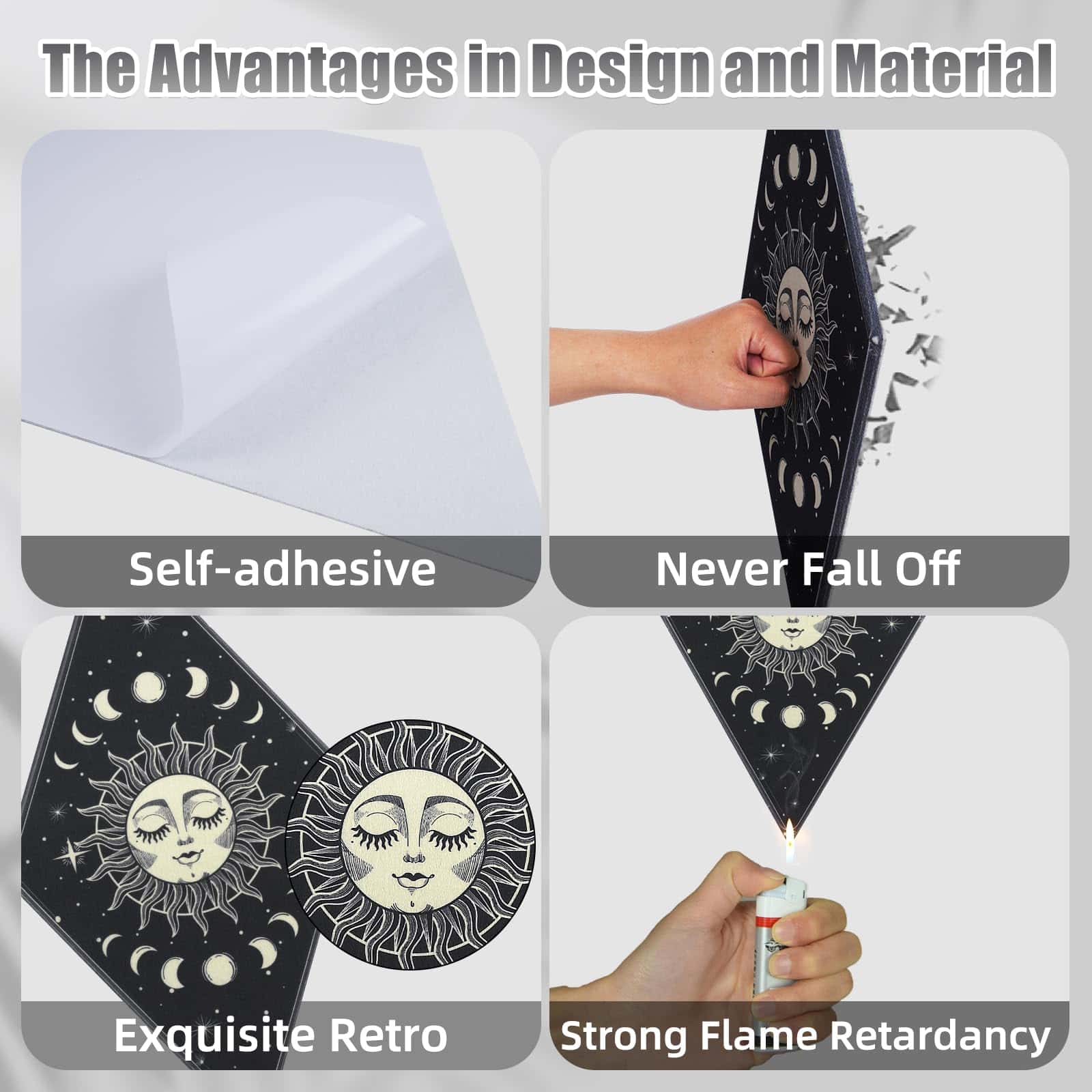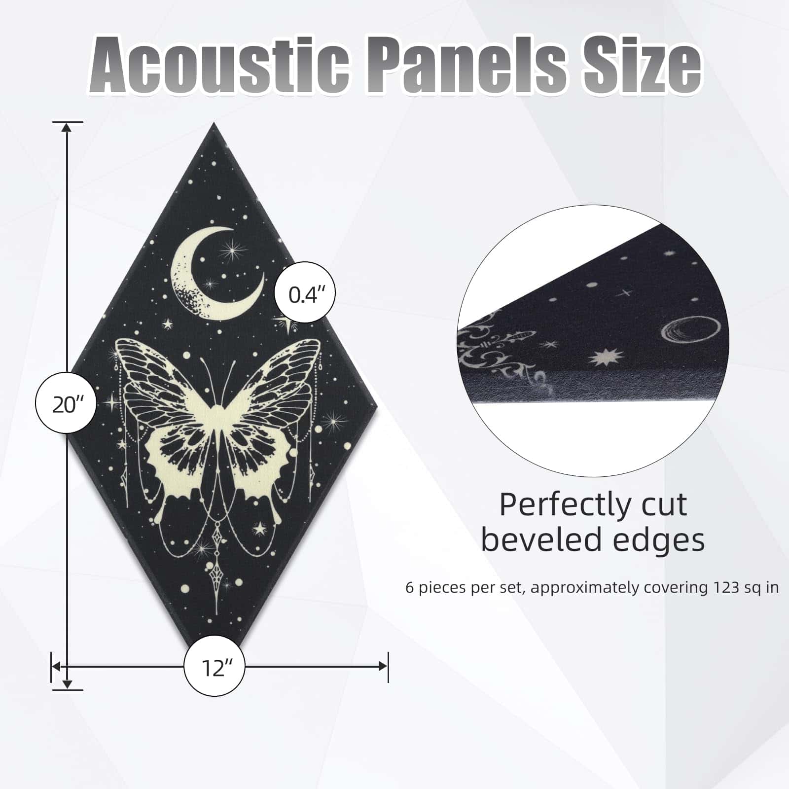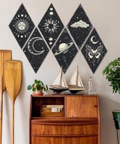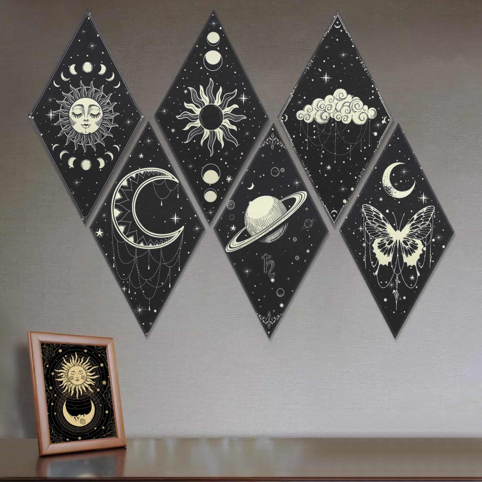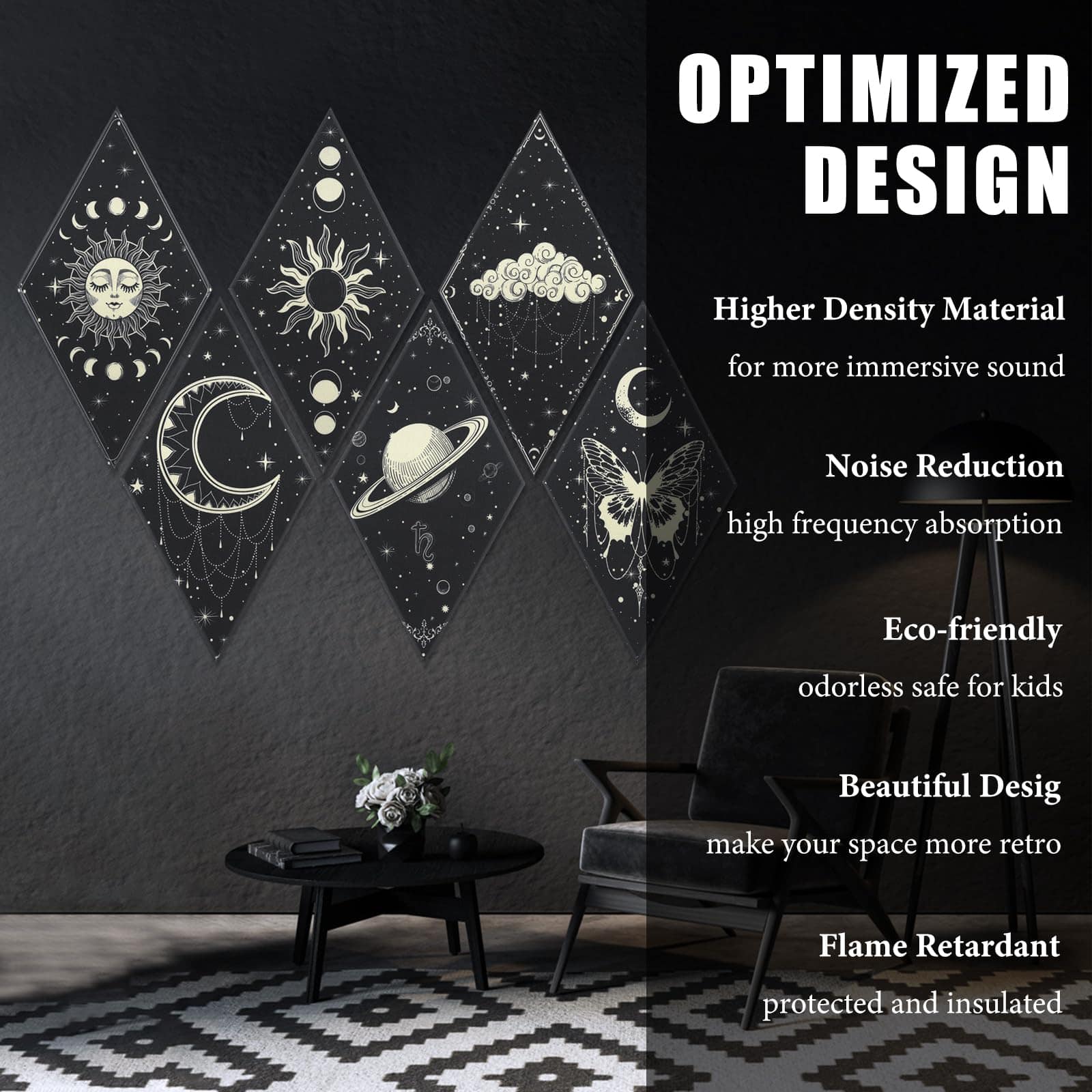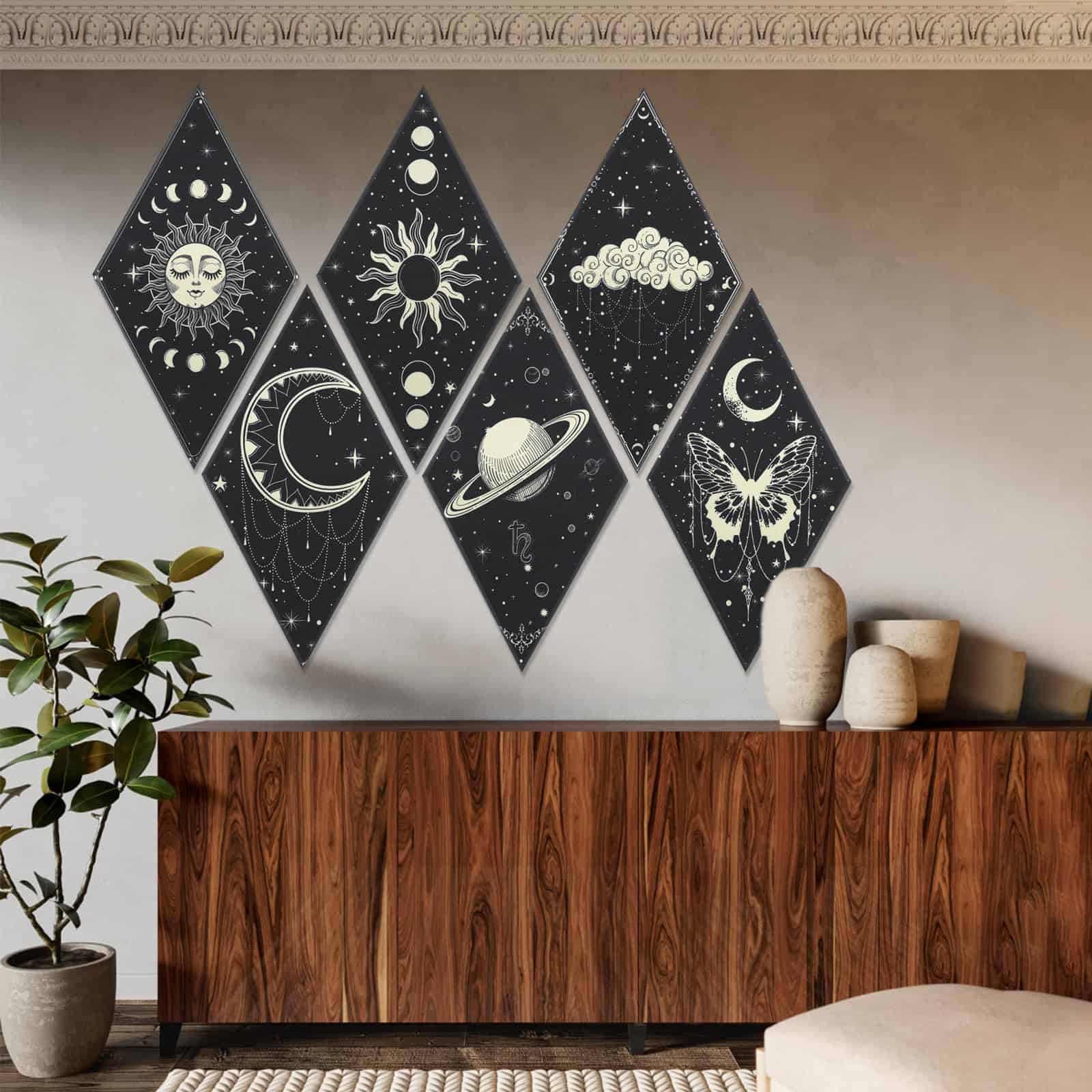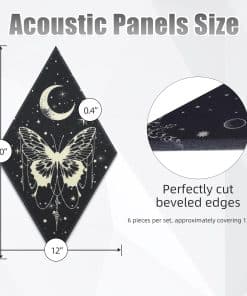 1. PANELES ACÚSTICOS MEJORADOS: recibirás 6 piezas de paneles de pared de arte lunar, diseñados en 6 patrones diferentes en el tema de sol y luna, principalmente de color negro y en forma de rombo; Diferente de otros paneles acústicos, hemos mejorado su rendimiento acústico y su apariencia. Los paneles acústicos absorben el sonido innecesario y desempeñan un buen papel en la decoración de la pared.