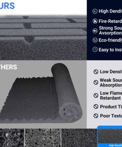 2. Material de alta densidad de 25 kg/m: Los paneles de pared insonorizantes están hechos de espuma de absorción de poliuretano 100%, que es ecológica, antideslizante, resistente a la corrosión y a la decoloración. Los paneles de insonorización también tienen una fórmula ignífuga. Mayor rendimiento en la eliminación de ruido innecesario.