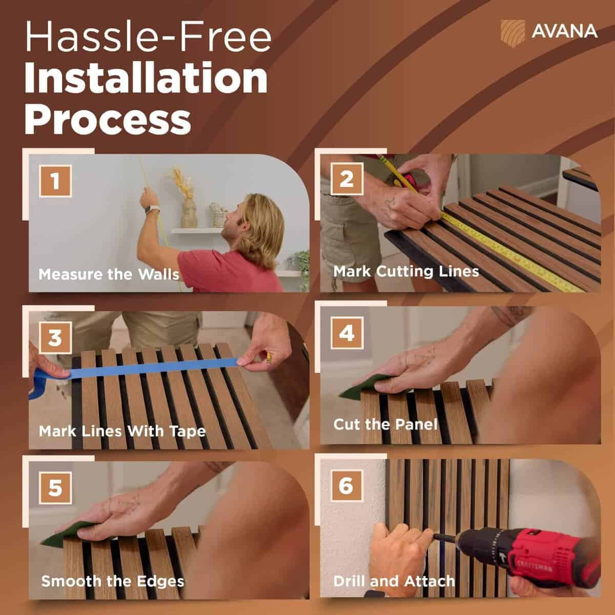 5. Tamaño conveniente del paquete Abrace la versatilidad de los listones de madera Avana para pared disponibles de forma conveniente en un paquete de dos. Para aquellos que buscan el acabado perfecto, recomendamos comenzar con un paquete de muestra como este panel de lamas de madera. Explore las diversas terminaciones ofrecidas para tomar una decisión informada antes de realizar el pedido final de estos paneles de decoración de pared. Disfrute de la flexibilidad de elección y la confianza que conllevan estos paneles de decoración de pared de madera. Mejore su espacio con nuestro panel de sonido de madera.