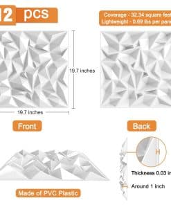 Tamaño – 19.7» X 19.7» X 1», paquete de 12, cobertura de 32.34 pies cuadrados; Ligero – 0.69 libras por panel; Material – Plástico PVC; Patrón geométrico especial con diseño de color mate.